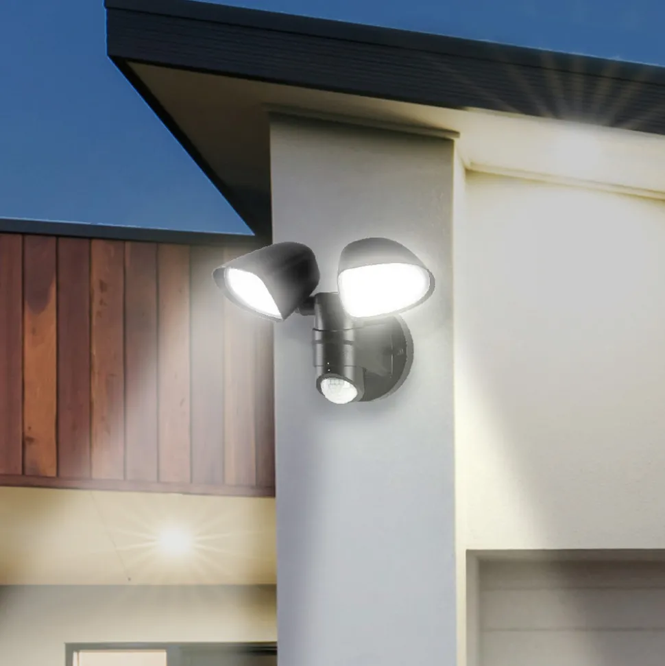 Bilbao LED utendørs vegglampe med to justerbare spotter og sensorstyring Bilbao utendørs vegglampe i robust plast er en svært funksjonell utendørs spotlight. De to spotlighthodene kan dreies 90° til sidene og 135° oppover/nedover, og hele lysenheten kan dreies 160° på veggfestet. Dette gjør det mulig å oppnå en målrettet og effektiv utendørsbelysning selv ved hushjørner, skråstier osv. De hvite universallysdiodene kan også slås på automatisk og etter behov, da Bilbao er utstyrt med en justerbar bevegelsessensor – Kapslingsklasse: IP44 – Sensor: rekkevidde justerbar fra 3 til 12 m, registreringsvinkel 150°, kan dreies 340° – Innkoblingstid justerbar fra 5 s til 3 min – Permanent lysfunksjon – Tilkoblingsfunksjon: armaturer med maks. 100 W samlet effekt kan kobles sammen