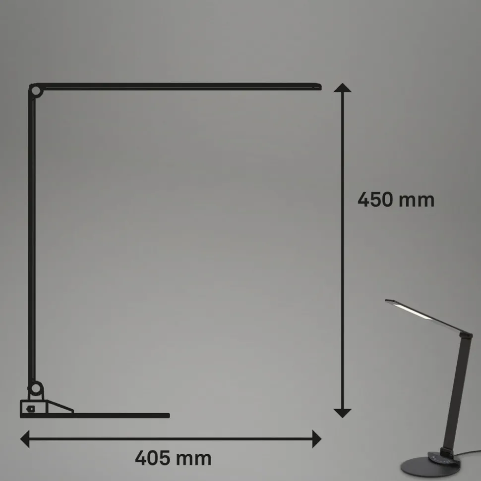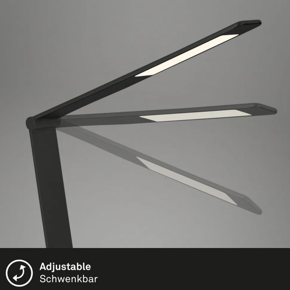 Svingbar LED-skrivebordslampe Haiti med berøringsdimmer og tretrinns justerbar lysfargeHaiti er en moderne skrivebordslampe hvis struktur er delt inn i en rund base og to flate og rektangulære armer. Begge er vippbare slik at høyden, projeksjonen og retningen på lyset kan justeres. Den øvre armen huser LED-modulen som lyser til den ene siden. Lyset styres via berøringsflaten på basen. I tillegg til en trinnløs dimmefunksjon er også en CCT-funksjon tilgjengelig, som gjør det mulig å velge mellom lysfargene varmhvit, universalhvit og dagslys. Takket være minnefunksjonen er den sist valgte innstillingen tilgjengelig igjen etter innkobling. Som ekstrautstyr er det integrert en USB-utgang som gjør det mulig å lade smarttelefoner osv.