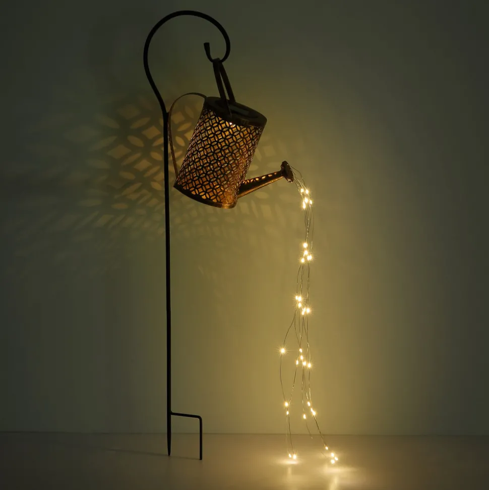 LED-solcellelampe 33652/336523 – Vannkanne, lampe med jordspyd Enhver hage kan dekoreres med denne effektive LED-solcellelampen. Vannkannen i metall, som henger fra et høyt jordspyd, er utstyrt med LED-lyslenker som imiterer vannstrålen og lyser opp og flimrer med stor effekt.