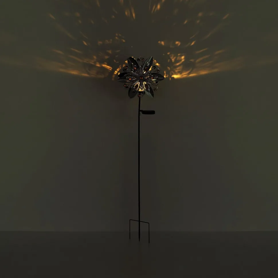 LED-solcellelampe 36578 i blomsterdesign med jordspyd Denne solcellelampen med jordspyd i filigran blomsterdesign er laget av rustfarget metall og dekorert med gule glasssteiner. Mellom de to blomstene sitter en klar glasskule med en varmhvit LED – med bryter på solcellemodulen