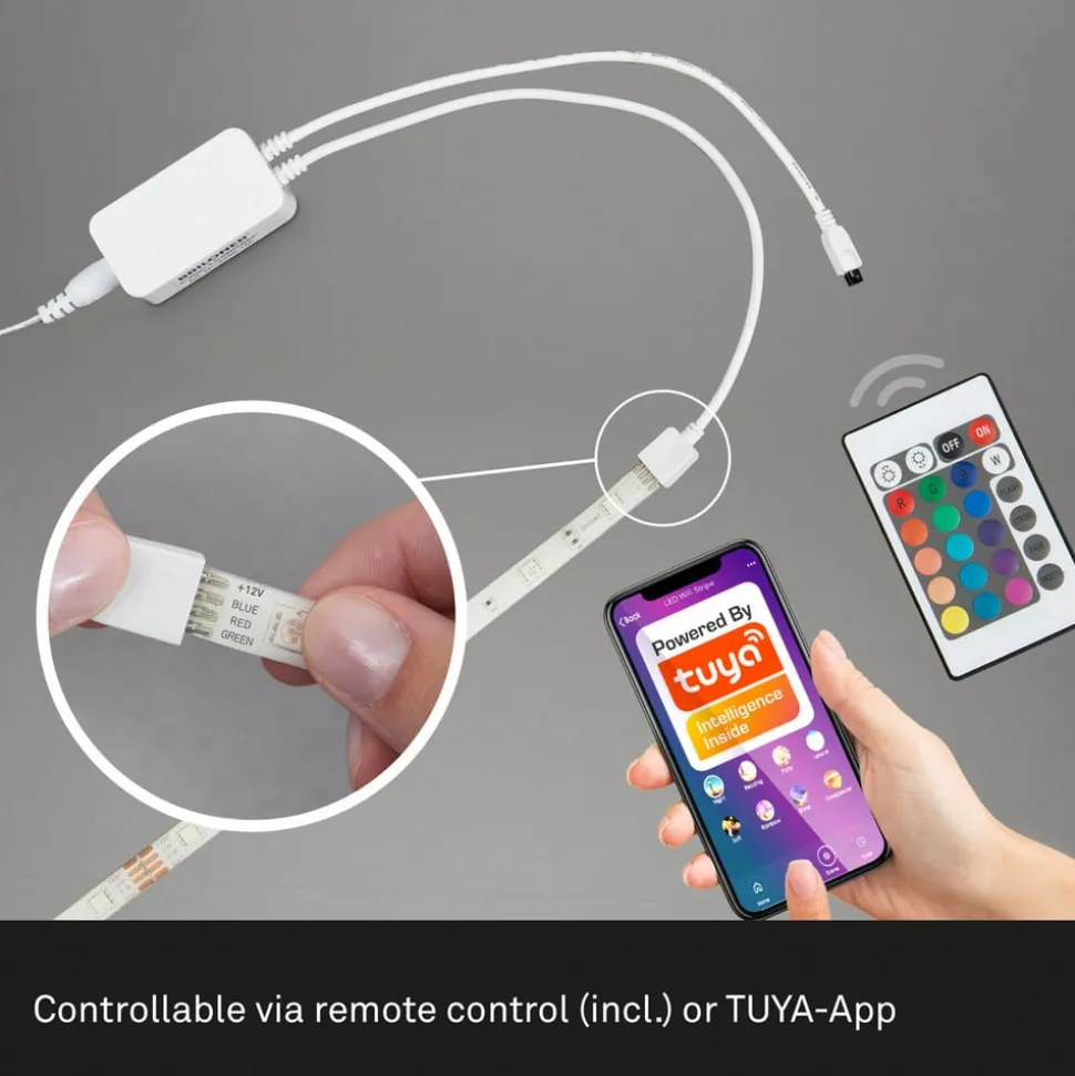 Bendo S LED-stripe med RGB-fargeskift og fjernkontroll, styrbar via Tuya smart For dekorativ bakgrunnsbelysning, koselig stemningsbelysning eller fargerik festbelysning – Bendo S LED-stripe kan brukes fleksibelt innendørs. Den er for eksempel ideell til å lyse opp stuen eller soverommet. LED-stripen er 5 meter lang og kan avkortes hver 10. cm, slik at den enkelt kan tilpasses de romlige forholdene. Bendo er selvklebende, så monteringen går som en lek, og LED-stripen kan styres med den medfølgende fjernkontrollen. Alternativt er det også mulig å foreta de ønskede innstillingene via den gratis tuya-appen eller med stemmekommando. På denne måten kan du styre RGB-fargeskiftet og justere lysstyrken. LED-stripen har også timer, minne og nattlysfunksjon. Fjernkontrollen og appen kan også brukes til å velge og konfigurere spesielle fargeprogrammer og lyseffekter – inkl. fjernkontroll – styring via tuya-appen for iOS og Android – stemmestyring via Amazon Echo og Google Home – dimbar – RGB-fargeskiftefunksjon – integrert timer-, nattlys- og minnefunksjon – selvklebende, transparent belagt – kan forkortes hver 10. cm – inkl. tilførselskabel og driver