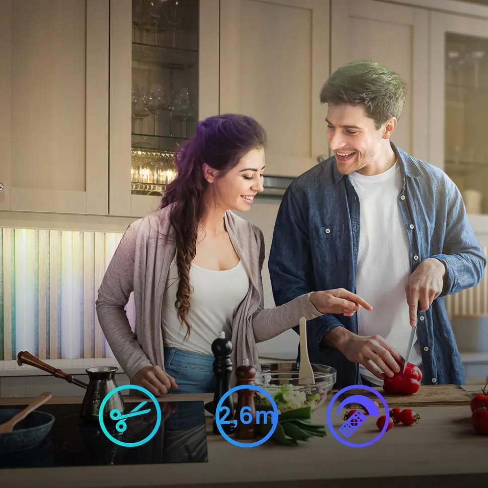 Forlengersett for LED-stripe Pimp panelet ditt startsett med RGBW, inkl. fjernkontroll Den 2,6 m lange LED-stripen kan forkortes for hver 12,5 cm. Den kan bare brukes sammen med det tilhørende startsettet (se tilbehør). Stripen er dimbar i det uendelige. Ulike farger og fargeprogrammer kan også stilles inn.