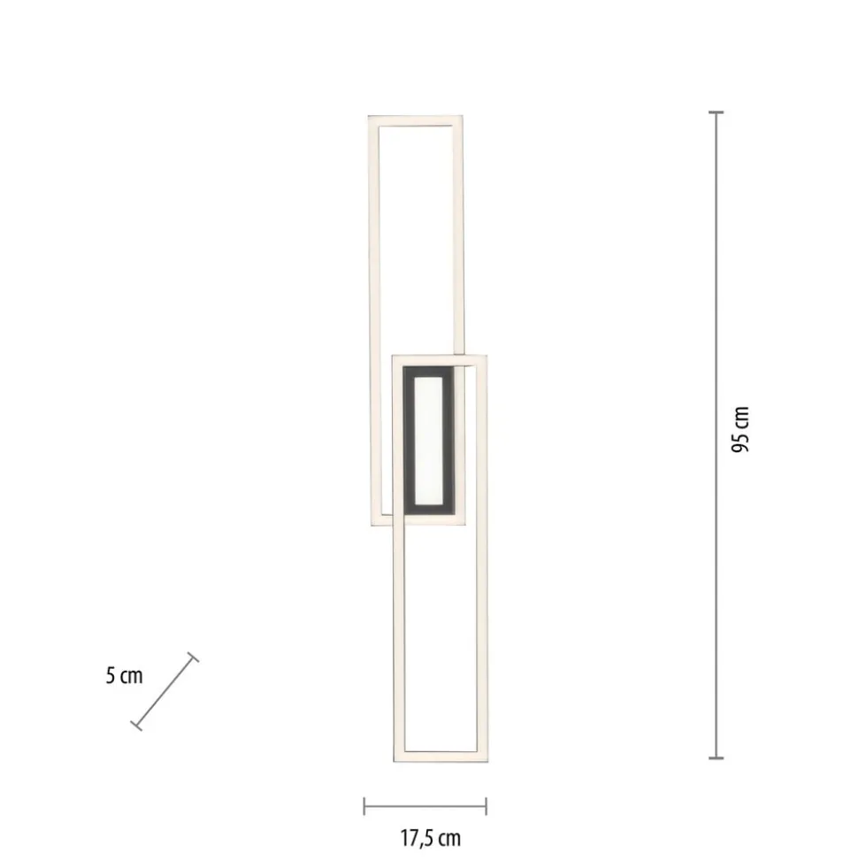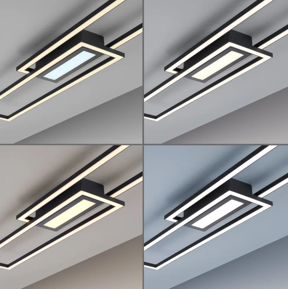 Svart Asmin LED-taklampe med to rektangler, dimbar Asmin LED-taklampe gir et allsidig lys med moderne design. Den består av to svært slanke, langstrakte rektangler som er forskjøvet fra hverandre, og en baldakin i midten. Disse kan styres i tre varianter ved hjelp av en veggbryter: Rektangler og baldakin sammen, rektangler alene eller baldakin alene. Når du slår på igjen, aktiveres den sist valgte innstillingen (minnefunksjon). Unge og dynamiske verdier kjennetegner varemerket JUST LIGHT. – tidligere kjent som Leuchten Direkt.