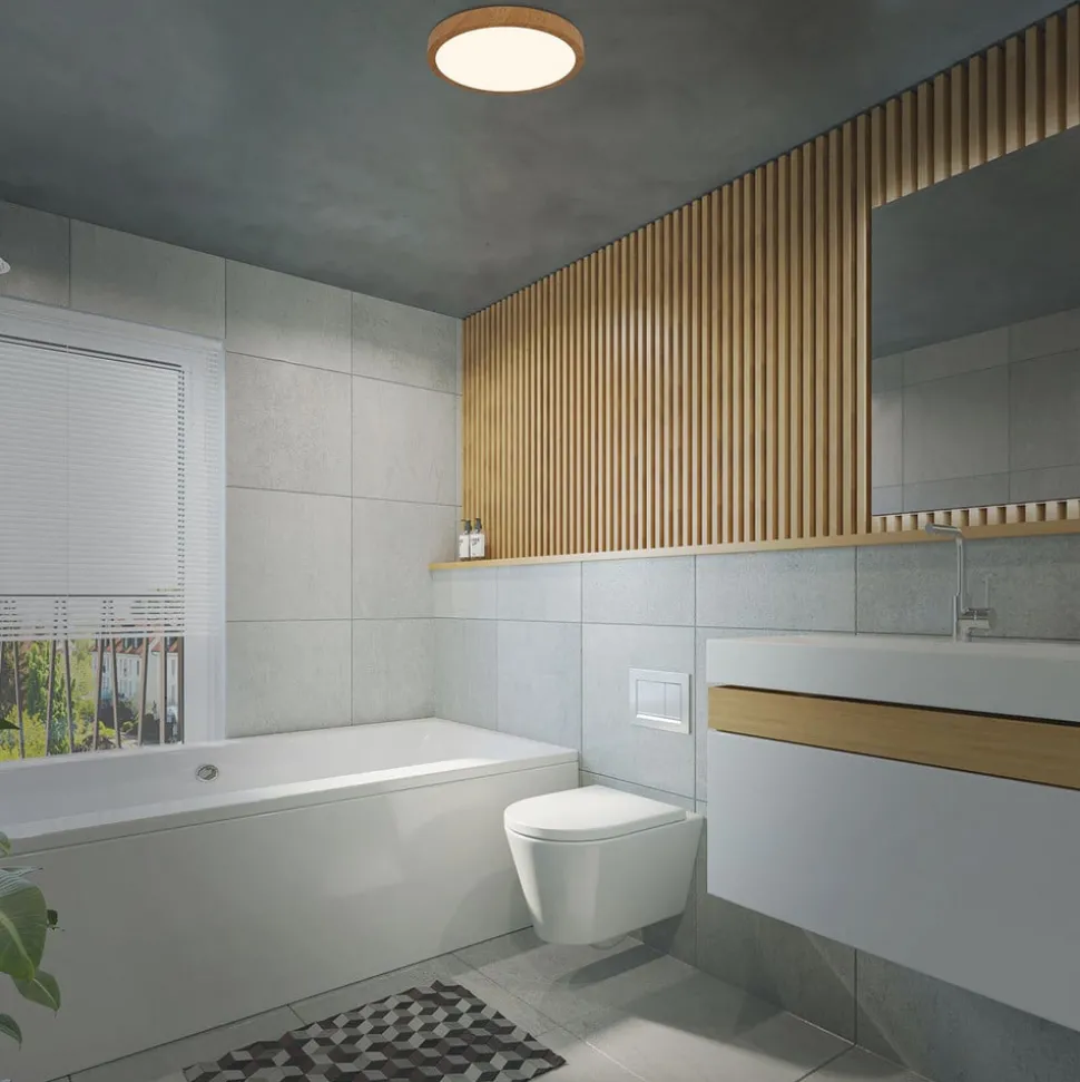 Runa Wood LED-taklampen kan brukes til å gi generell generell belysning. Den runde taklampen er veldig smal og har en trefarget metallramme. Varmhvite lysdioder ble installert bak den satengdekkede plastdiffusoren og sender ut lyset direkte nedover.