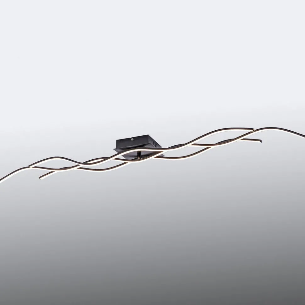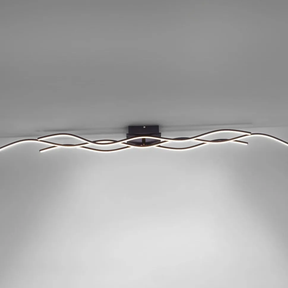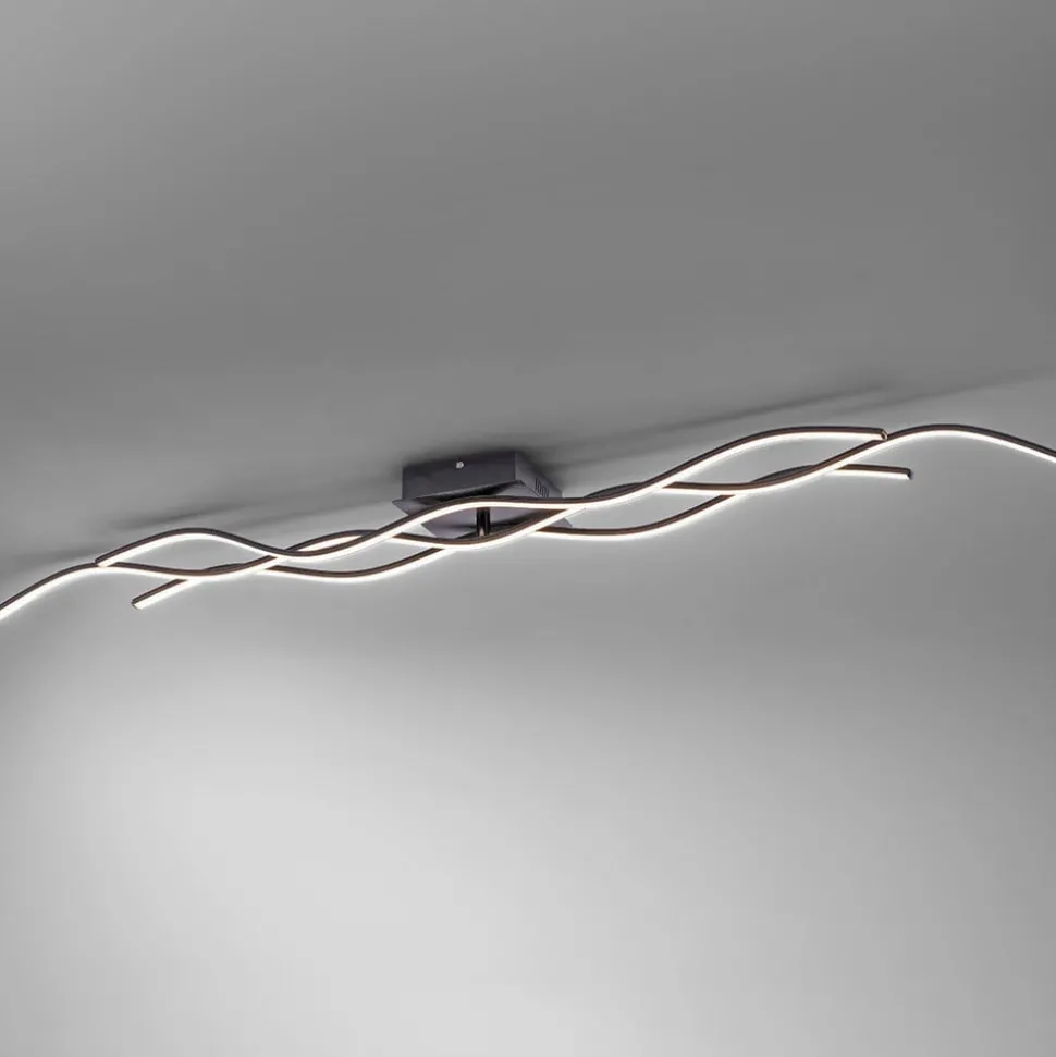 LED-taklampe Wave i svart Denne taklampen er spesielt lang og egner seg derfor spesielt godt i store rom, i smale ganger eller over langbord. Den består av tre svært filigrane elementer utstyrt med lysdioder som ser ut til å bevege seg i bølger langs taket. Det enkle, svarte opphenget er diskret og lar lampens form og lys komme til sin rett. Den buede, dynamiske designen harmonerer med moderne møbler og kan fint kombineres med rette linjer for å bryte dem opp stilistisk og visuelt.
