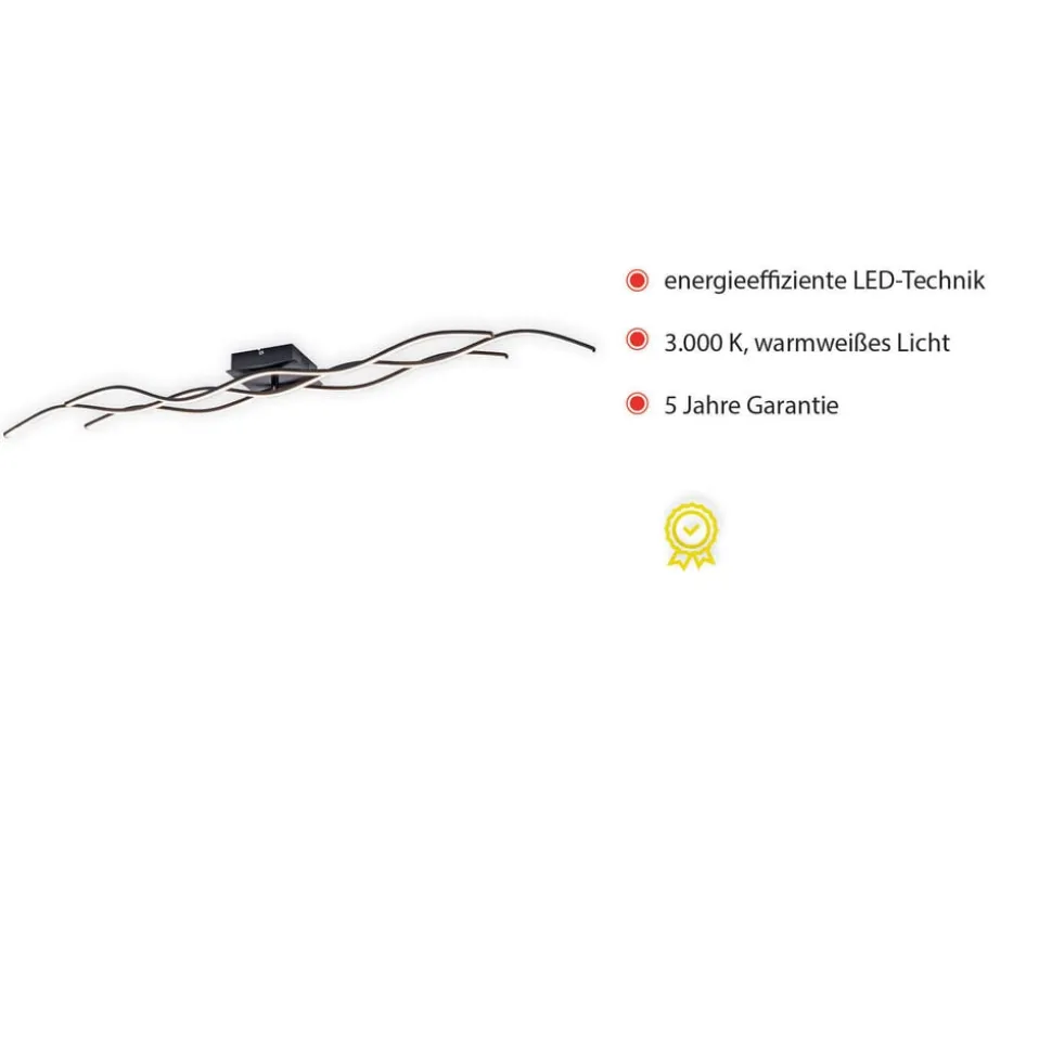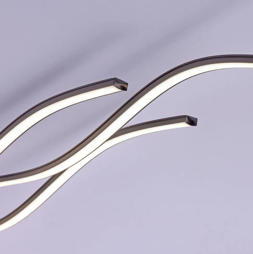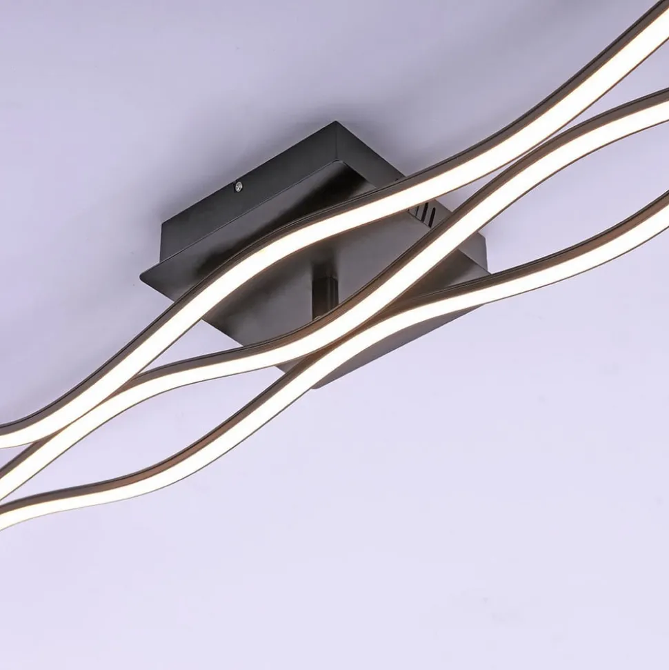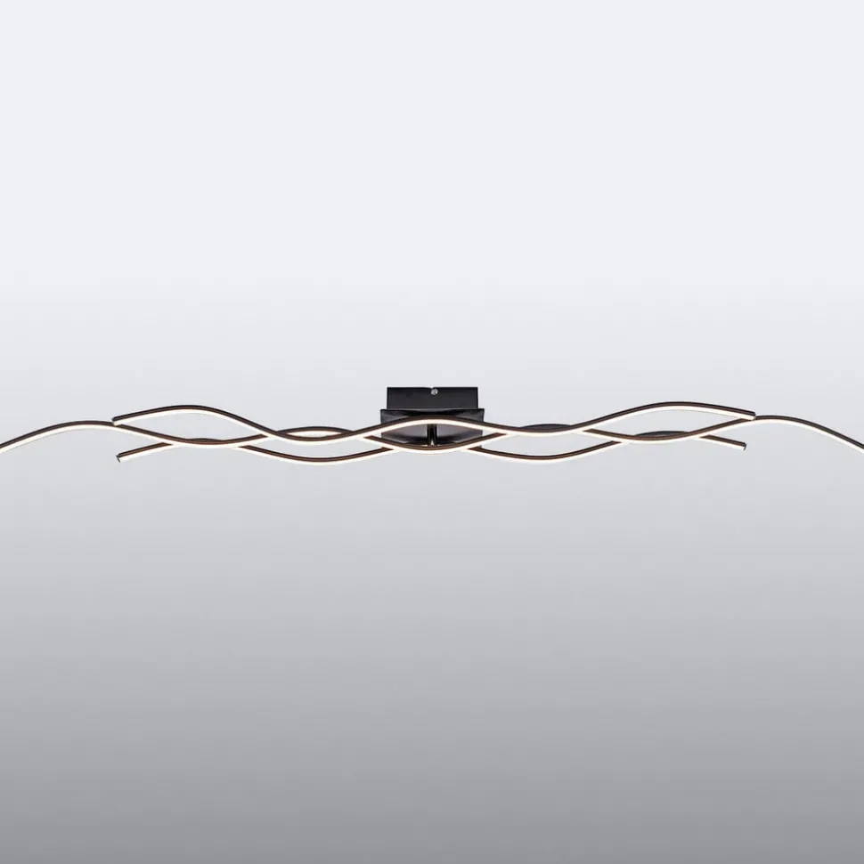 LED-taklampe Wave i svart Denne taklampen er spesielt lang og egner seg derfor spesielt godt i store rom, i smale ganger eller over langbord. Den består av tre svært filigrane elementer utstyrt med lysdioder som ser ut til å bevege seg i bølger langs taket. Det enkle, svarte opphenget er diskret og lar lampens form og lys komme til sin rett. Den buede, dynamiske designen harmonerer med moderne møbler og kan fint kombineres med rette linjer for å bryte dem opp stilistisk og visuelt.