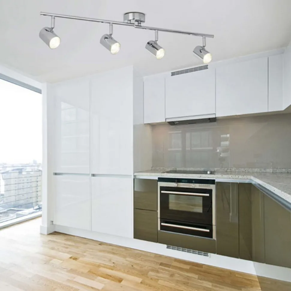 takspotlight Rollo med fire flammer har bevegelige armaturhoder som gjør at lyset kan rettes mot hver side av rommet. De er utstyrt med energieffektive lysdioder som jevnt opplyser rommet med et varmt hvitt lys. De to armene til spotlighten med fire flammer kan også svinges. Dette gjør LED-spotlight perfekt hvor solid grunnbelysning er nødvendig, for eksempel i den moderne stuen, gangen eller kjøkkenet.