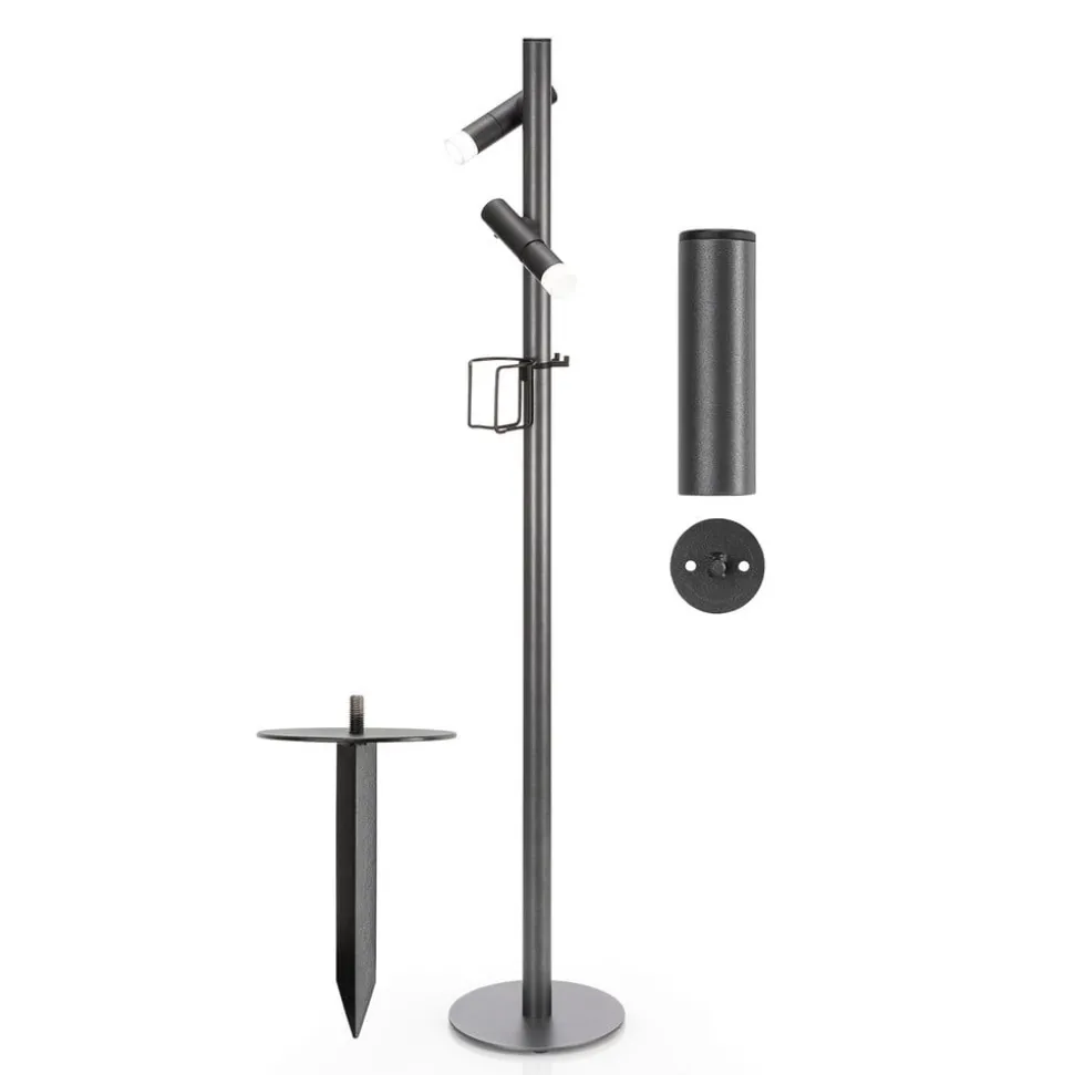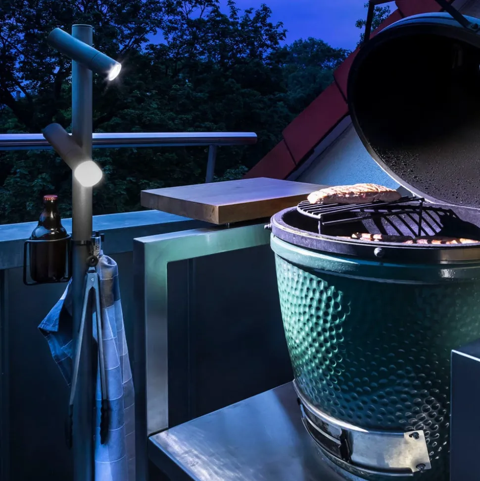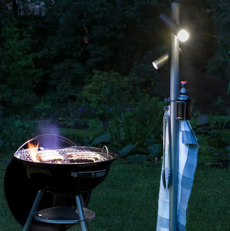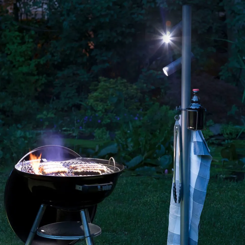 Den praktiske multiringen med tre hengekroker gir plass til forskjellige redskaper som trengs, for eksempel for grilling. Koppholderen betyr at det ikke er behov for et sidebord. De to LED-lommelyktene er festet magnetisk. Dette gir muligheten for å feste lyskildene til standrøret i hvilken som helst høyde og retning. Fokuset kan justeres ved å dreie den fremre delen av lampen. LED-batterilommelyktene har to lysnivåer og en lommelykt. Ved hjelp av diffusorutstyret kan det skapes blenderfri allsidig belysning, som skaper en atmosfærisk atmosfære. Med veggfeste kan en LED-lommelykt også festes til ytterveggen eller til veggen.