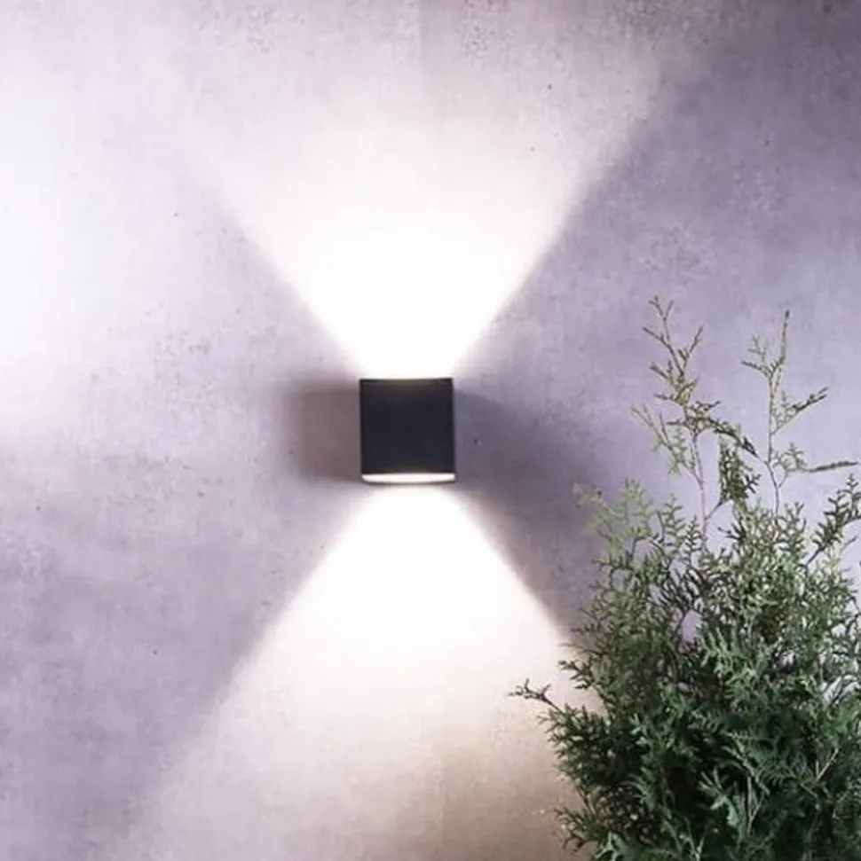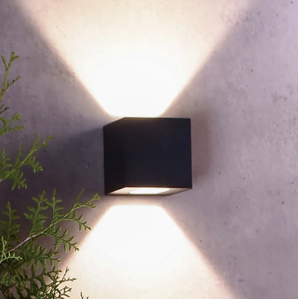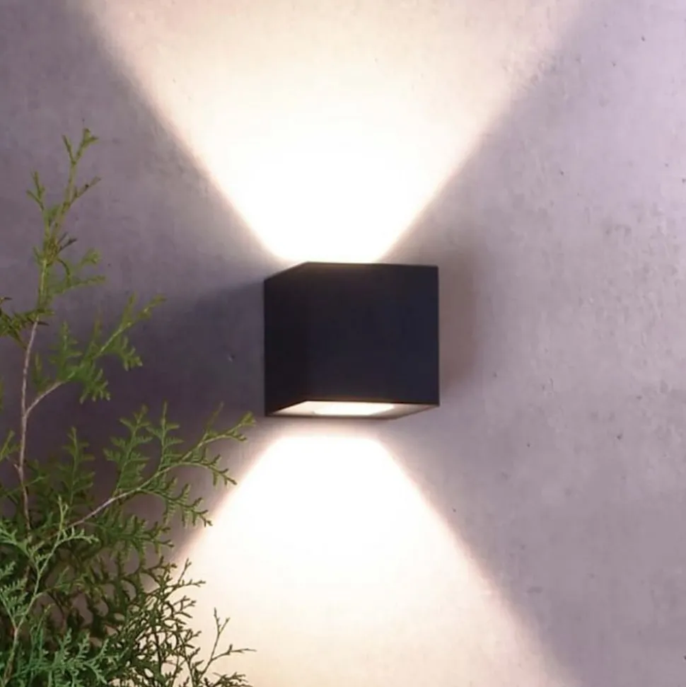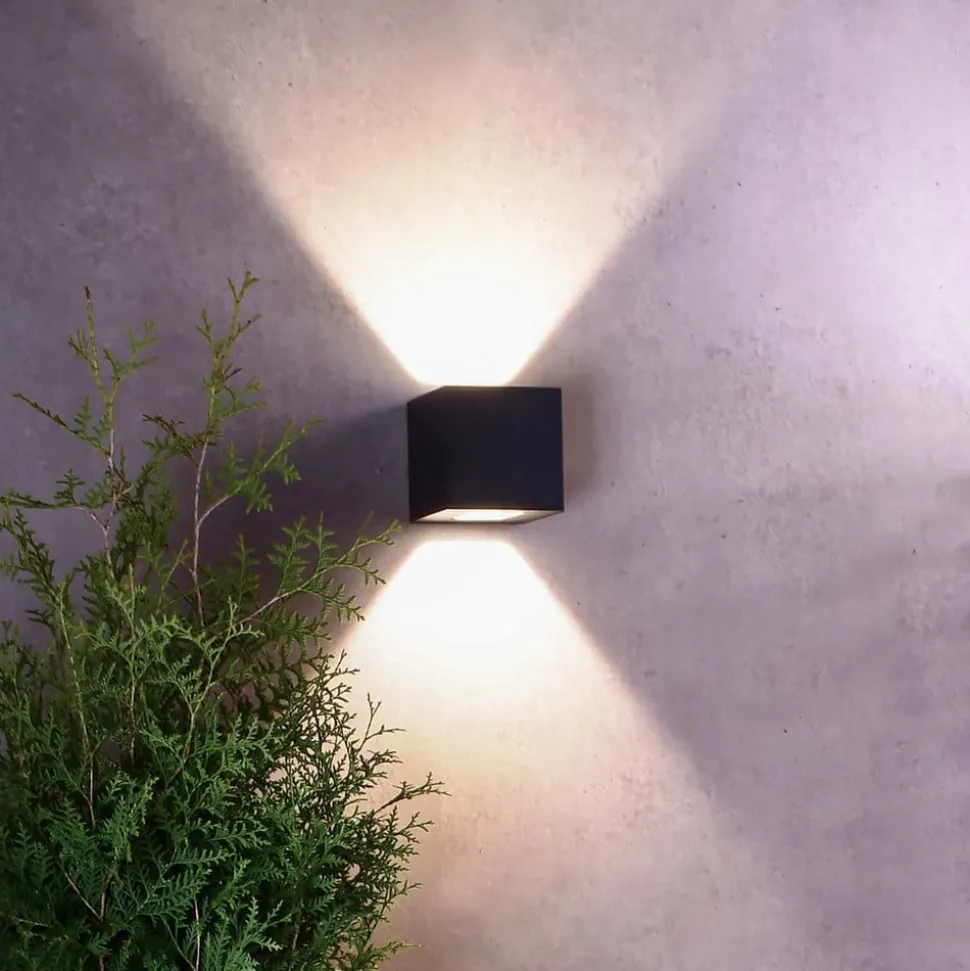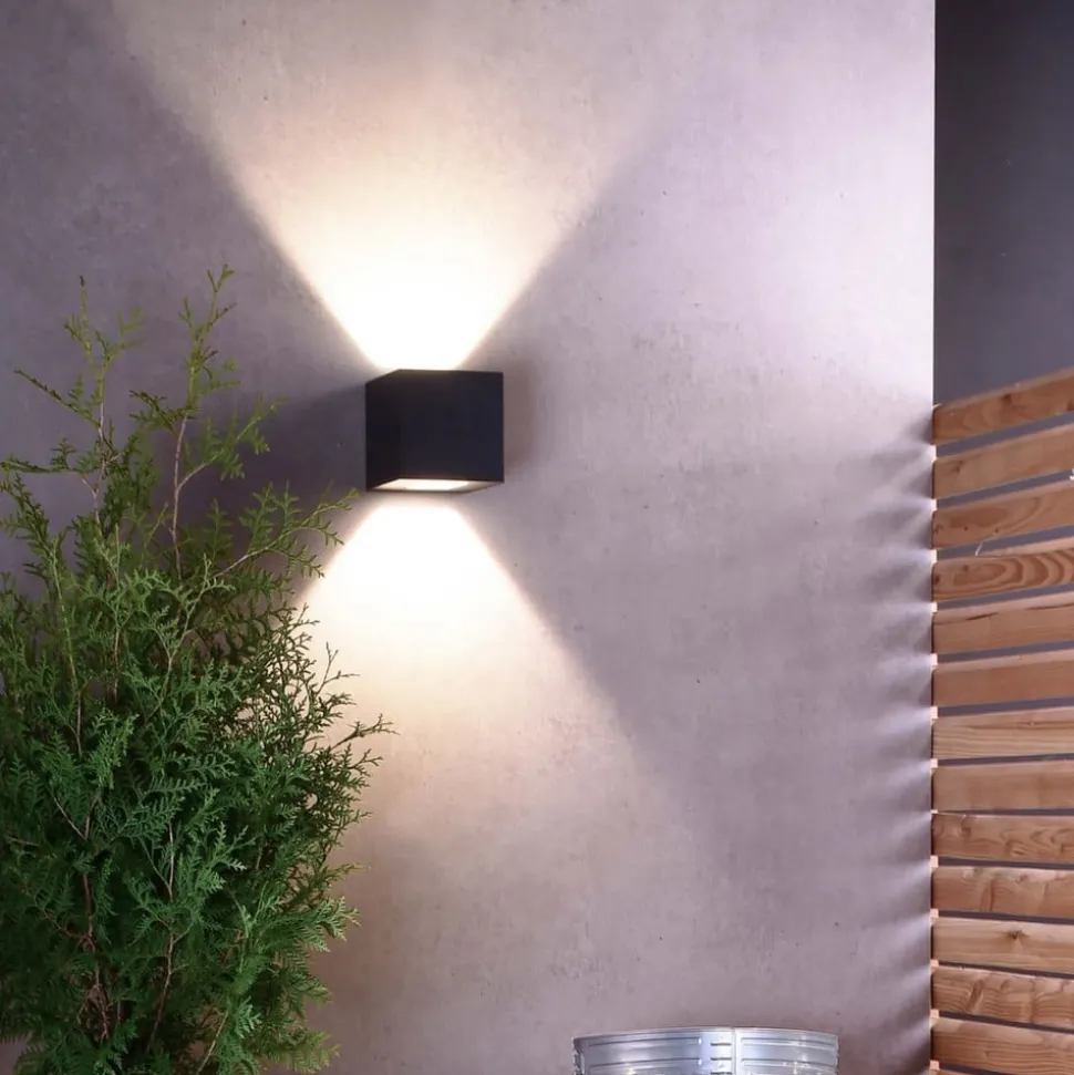 Kubeformet LED-vegglampe Jabbah med lysfordeling opp- og nedover Takket være sin diskré design som en mørkegrå kube kan Jabbah-vegglampen i støpt aluminium integreres i nesten alle miljøer. LED-lampene avgir et varmhvitt lys som begrenses til en vinkel på 75° av uttakene. Dette skaper skarpt definerte opp- og nedtoninger. Takket være det høye lysutbyttet gjør den utendørs vegglampen det også enklere å orientere seg i omgivelsene – Lysutbyttet kan reduseres til 60 % ved hjelp av en DIP-bryter før idriftsettelse – Kapslingsgrad: IP65 – Omgivelsestemperatur under drift: – 20 °C til + 40 °C
