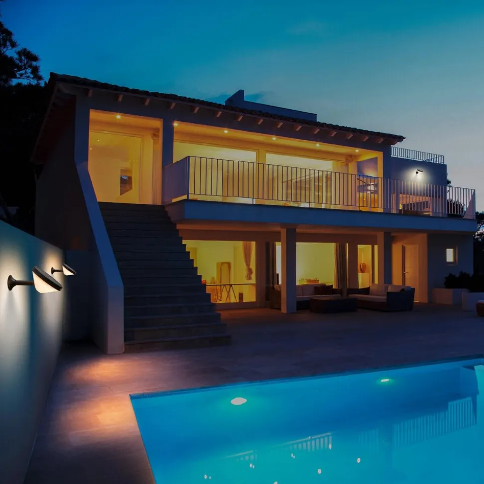 Sensorstyrt Endura Style Solar Lunar LED-vegglampe med nedadrettet lysutslipp Den runde kroppen til Endura Style Solar Lunar utendørs LED-vegglampe er laget av svart ABS-plast og har en sylindrisk, opal diffusor på undersiden. Denne sprer det varmhvite lyset fra de integrerte LED-lampene homogent til alle sider. Den slås bare på når det er mørkt og folk går forbi; utendørs vegglampen er utstyrt med en dagslys- og bevegelsessensor for dette formålet. I tillegg til en ekstern lysbryter er det heller ikke behov for strømtilkobling, da Endura Style Solar Lunar har en solcellemodul på toppen og et integrert oppladbart batteri. Belysningstid etter bevegelsesdeteksjon: 30 s Bevegelsessensor: registreringsvinkel 100°, rekkevidde 5 til 8 m Dagslyssensor: deteksjonsterskel 0 til 25 lx