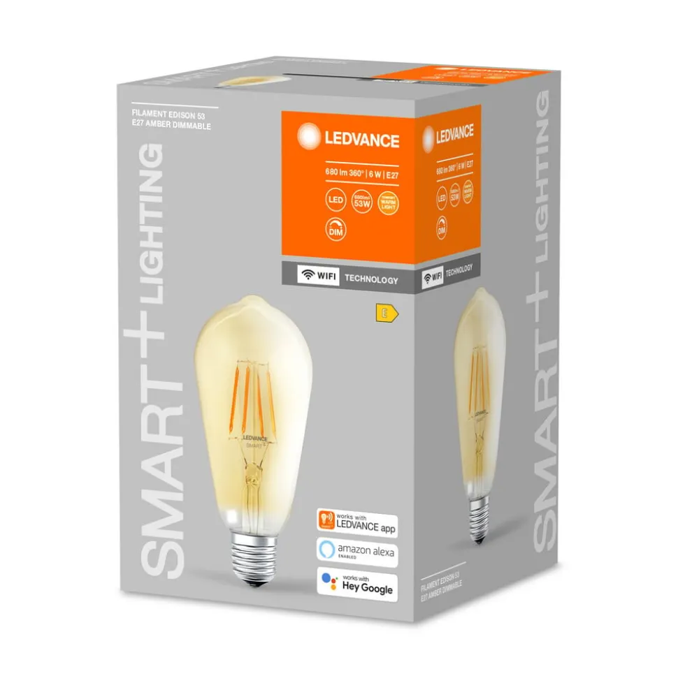 LEDVANCE SMART WiFi E27 LED-lampe Edison Filament ST64 gold med 6W, varmhvit, for styring via WLANSmart styrbart, varmhvitt lys for konvensjonelle armaturer leveres av denne WiFi-kompatible E27 ST64 LED-filamentlampen Edison i rustikk form med gullfarget glasspære. Bytte og dimming skjer via en app på smarttelefonen/nettbrettet eller med talekommando. Koblingen til nettbrettet/smarttelefonen eller smartintegrasjonen skjer via WLAN takket være SMART WiFi-teknologien, uten behov for gateway eller bro. Spesielle funksjoner/kompatibilitet: – kan styres med LEDVANCE SMART WiFi-appen (gratis tilgjengelig for iOS og Android); muliggjør forhåndsinnstillinger og automatiseringer – styring via Google Assistant eller Amazon Alexa mulig – dimbar – lysfarge: varmhvit (2400 K) – nettverksprotokoll: WiFi