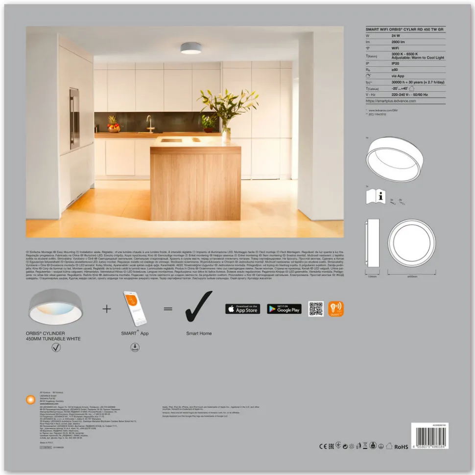 – kontrollerbar med LEDVANCE SMART+ WiFi-appen (tilgjengelig gratis for iOS og Android ); muliggjør forhåndsinnstillinger og automatiseringer