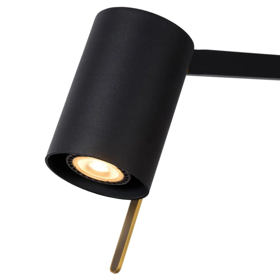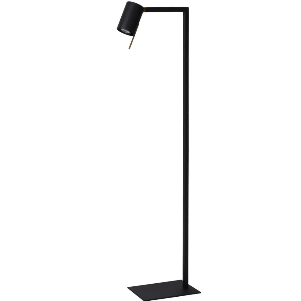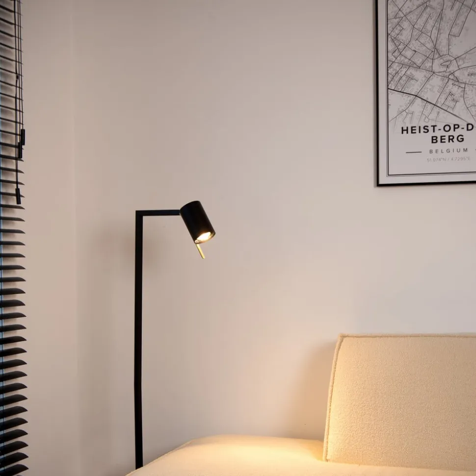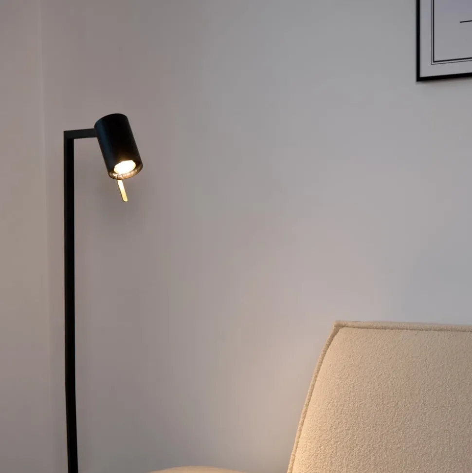 Klassisk Lesley-gulvlampe med et tydelig formspråk Lesley-gulvlampen er den klassiske formen på en gulvlampe. En stabil sokkel, et veldig rett stativ med en utstikkende, horisontal arm som bærer det sylinderformede lampehodet i enden – dette er en perfekt beskrivelse av lampens komponenter. GU10-sokkelen, som kan utstyres med en passende lyskilde, er innebygd i lampekroppen. Dette gir en lett blendingsbeskyttelse, og lyset sendes nedover i en direkte stråle. Som en diskret detalj er det festet en gyllen brakett i armaturens nedre ende, som kan brukes til å vippe hodet vertikalt. Dette gjør det mulig å rette lyset bedre. En bryter er festet til kabelen for å slå gulvlampen av og på.