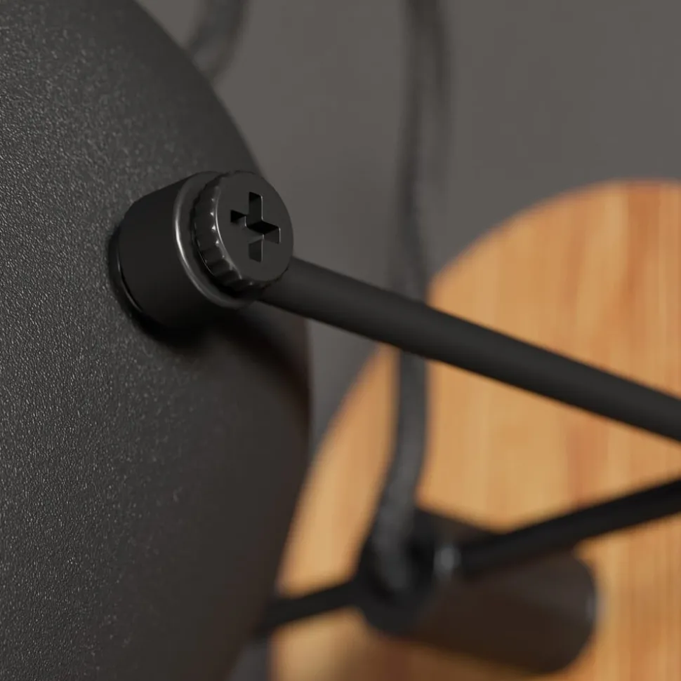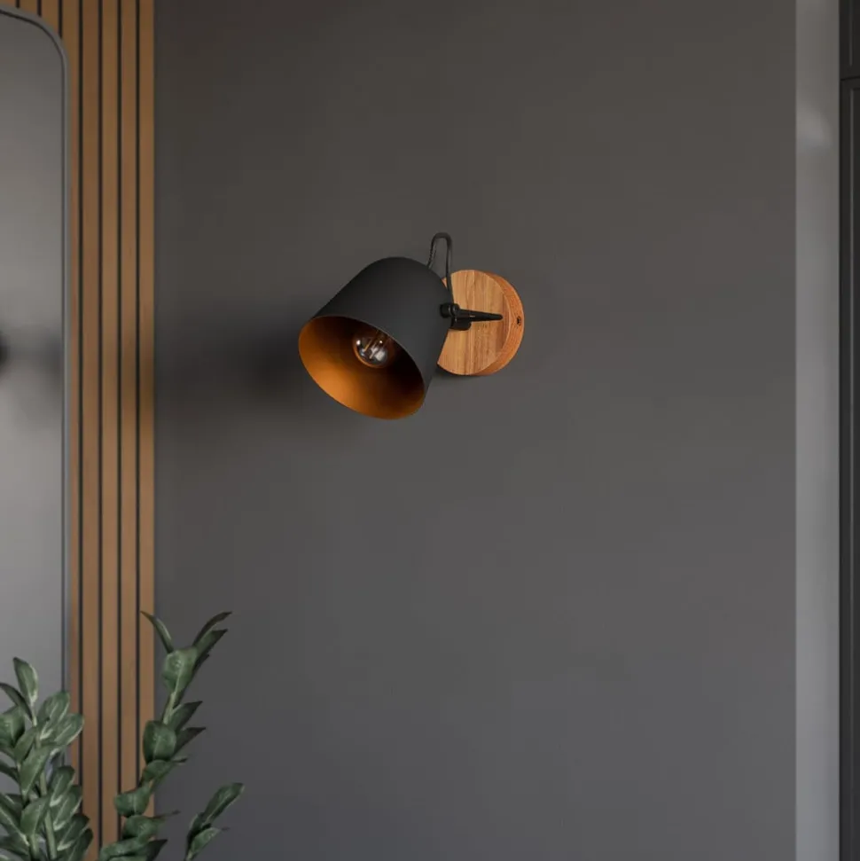 Slående vegglampe Adalin laget av eik og stål med lampeskjerm i sort og gull