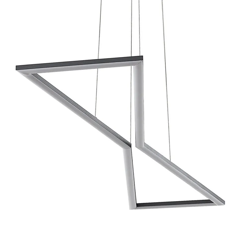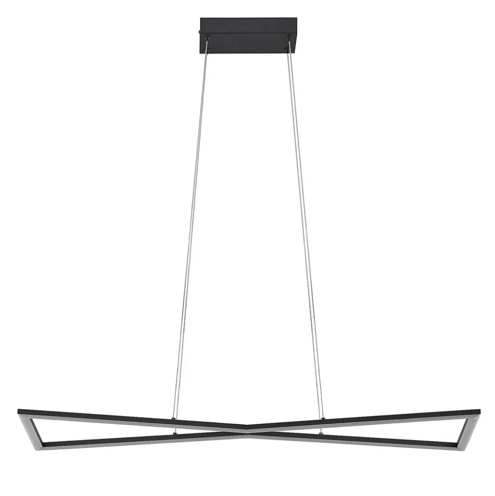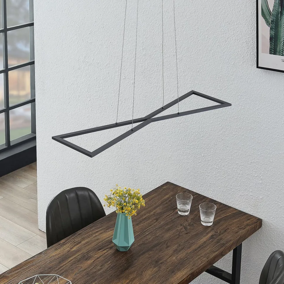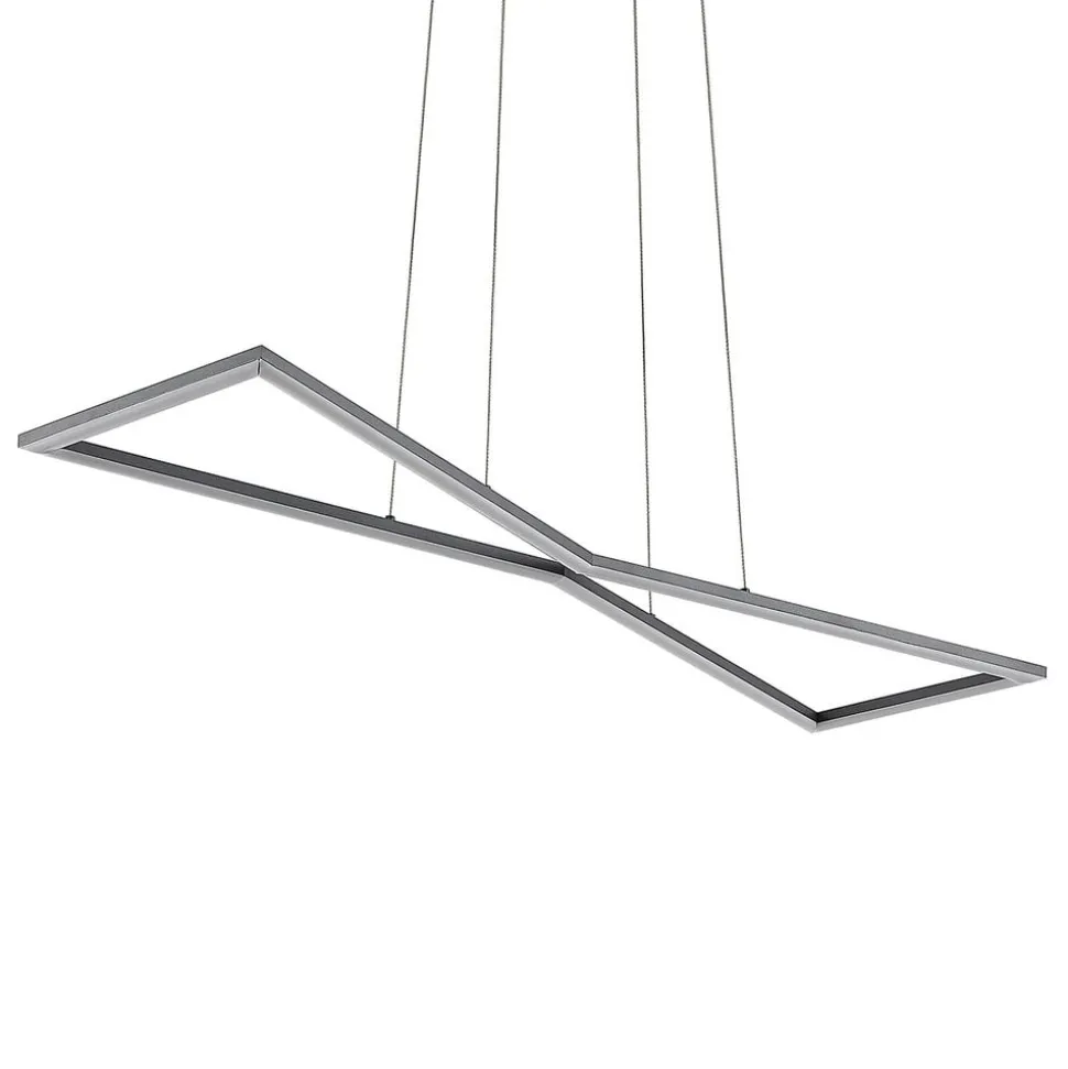 LED-hengelampen Arischa imponerer med sin moderne og symmetriske design. Dens kantete lampehus, som består av smale stag, som minner om et timeglass i form, sitter på en oppheng. Den er laget av stål, som også gir den et elegant og elegant utseende. Men det er ikke bare optiske egenskaper som taler for dem, men også deres praktiske funksjonelle egenskaper. En veggbryter gjør at lampen kan slås på og av som vanlig. Takket være 3-nivå dimmeteknologien med integrert av-funksjon, kan den også dempes til tre forskjellige lysstyrkenivåer ved å trykke på bryteren flere ganger: 100%, 40% og 10%. På grunn av opphenget og den romslige utformingen, er LED-hengelampen perfekt for montering over spisebordet og gir riktig belysning.