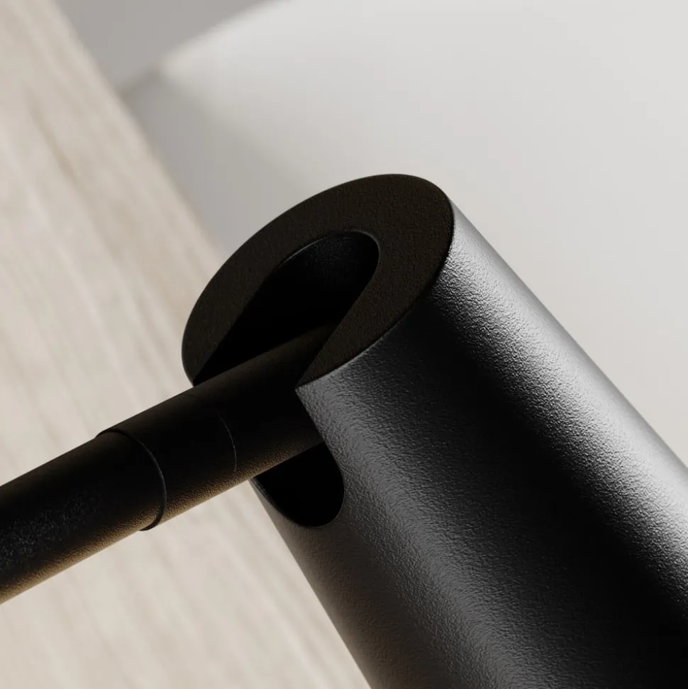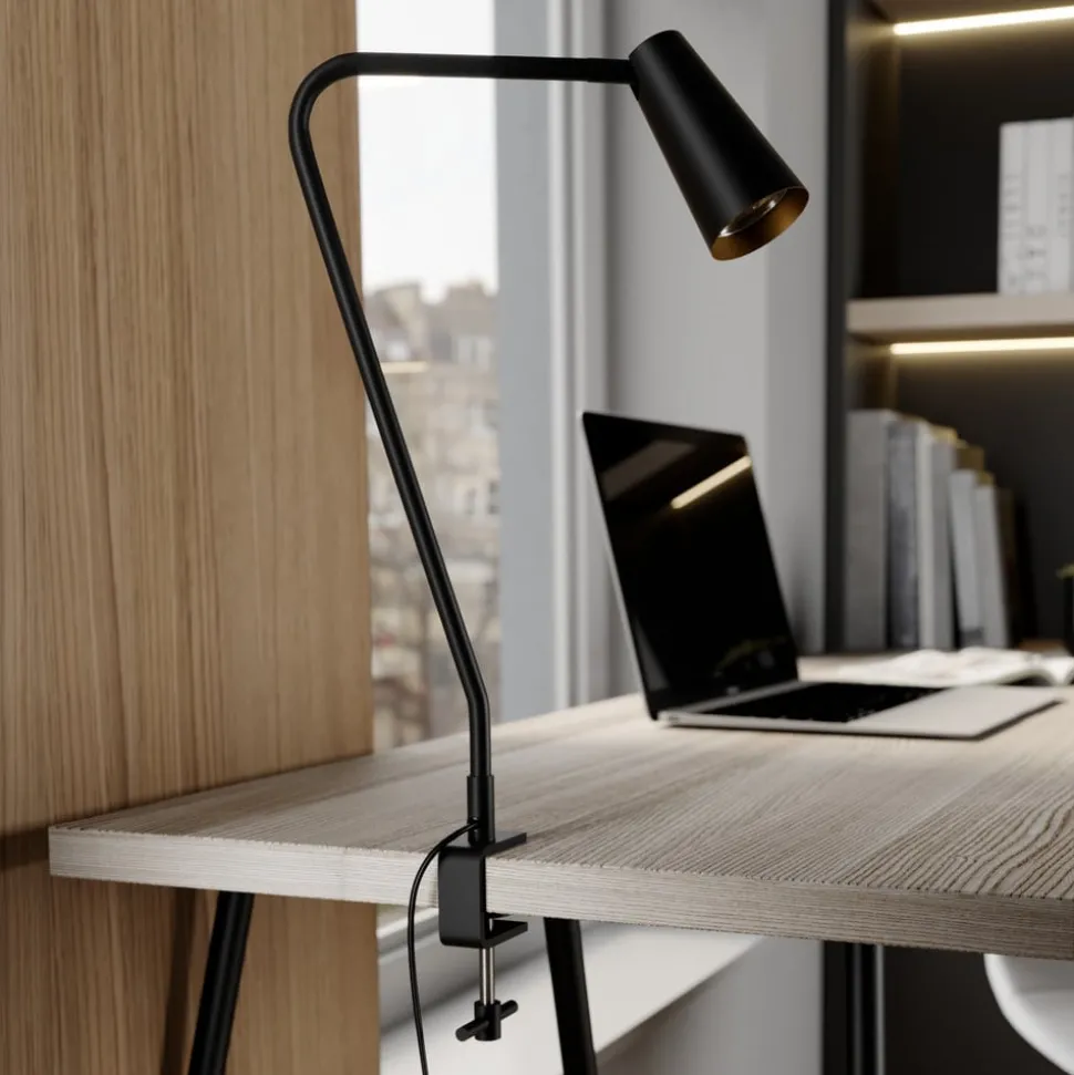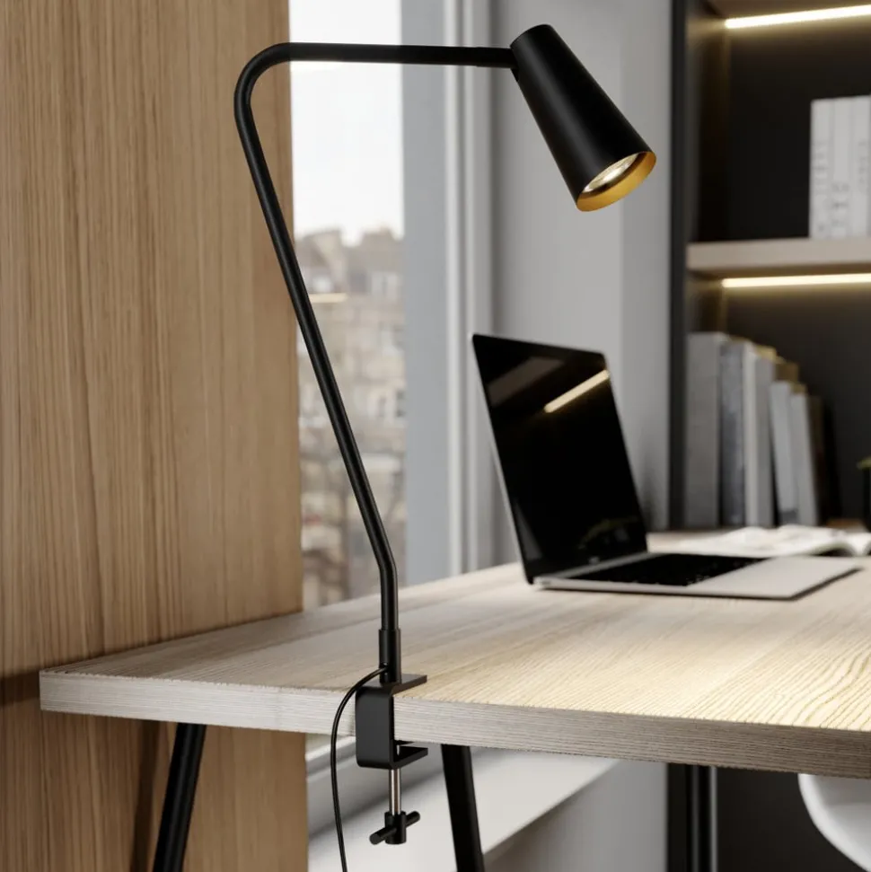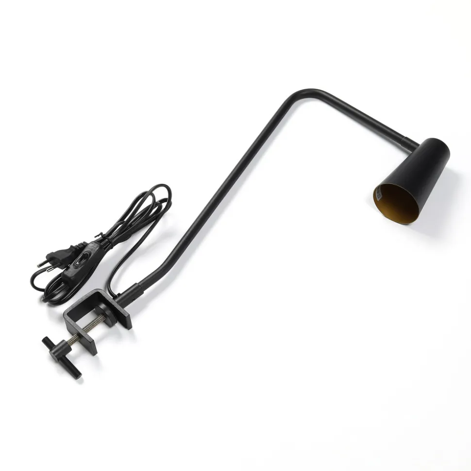 Angelina klemmelampe i metall, svart og gull Angelina er en svært elegant lyskilde som er designet for å klemmes fast på bordkanten, noe som gir den et sikkert grep og gjør det mulig å installere den der det ikke er nok plass til en vanlig lampefot. I likhet med skjermen er stativet laget av metall, og det er bare innsiden av skjermen som skiller seg ut i farge, da den skinner gyllent og dermed bidrar til et spesielt utseende i tillegg til å ha en varmtonet effekt på lyset. Den smale, koppformede lampeskjermen kan svinges, slik at den kan justeres bedre, og det er en bryter på lampen slik at Angelina raskt kan slås av og på.