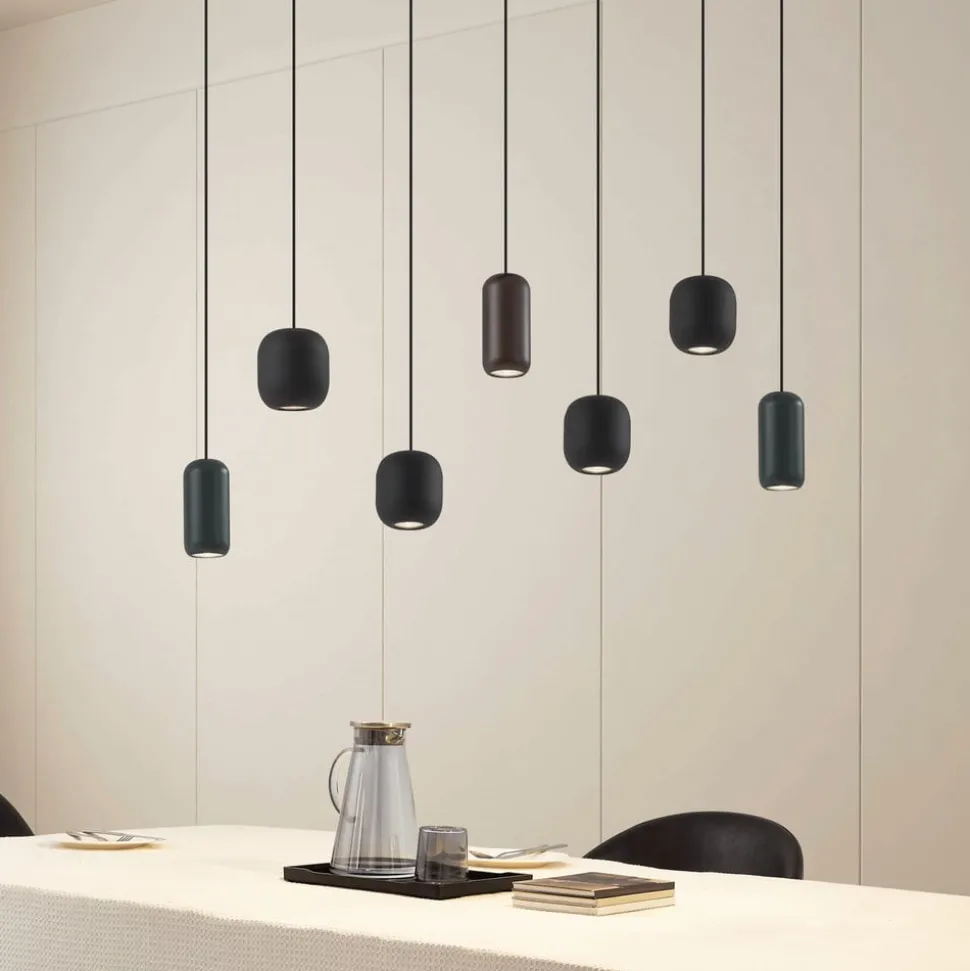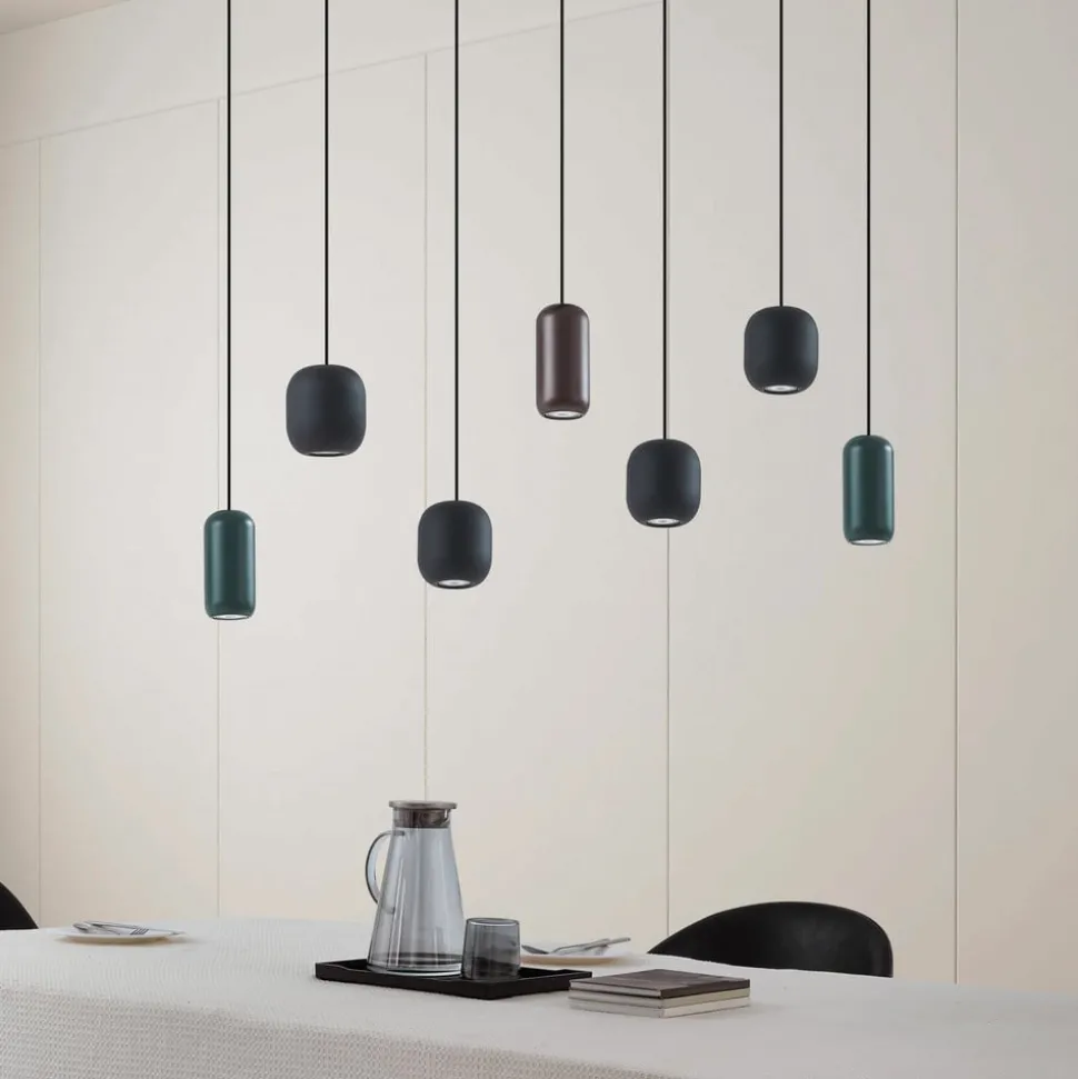 Linearitet møter fargeaksenter – Narion pendellampe Narion pendellampe fra Lucande er laget av metall og jern, og med sin lineære form og tiltalende fargekombinasjon av svart, brunt og grønt er den et både moderne og stilfullt designelement. Den matte, elegante overflaten på de syv lampeskjermene i ulike former setter et flott preg på rommet. De sender lyset direkte nedover, noe som gjør pendellampen ideell til å belyse spiseplassen.