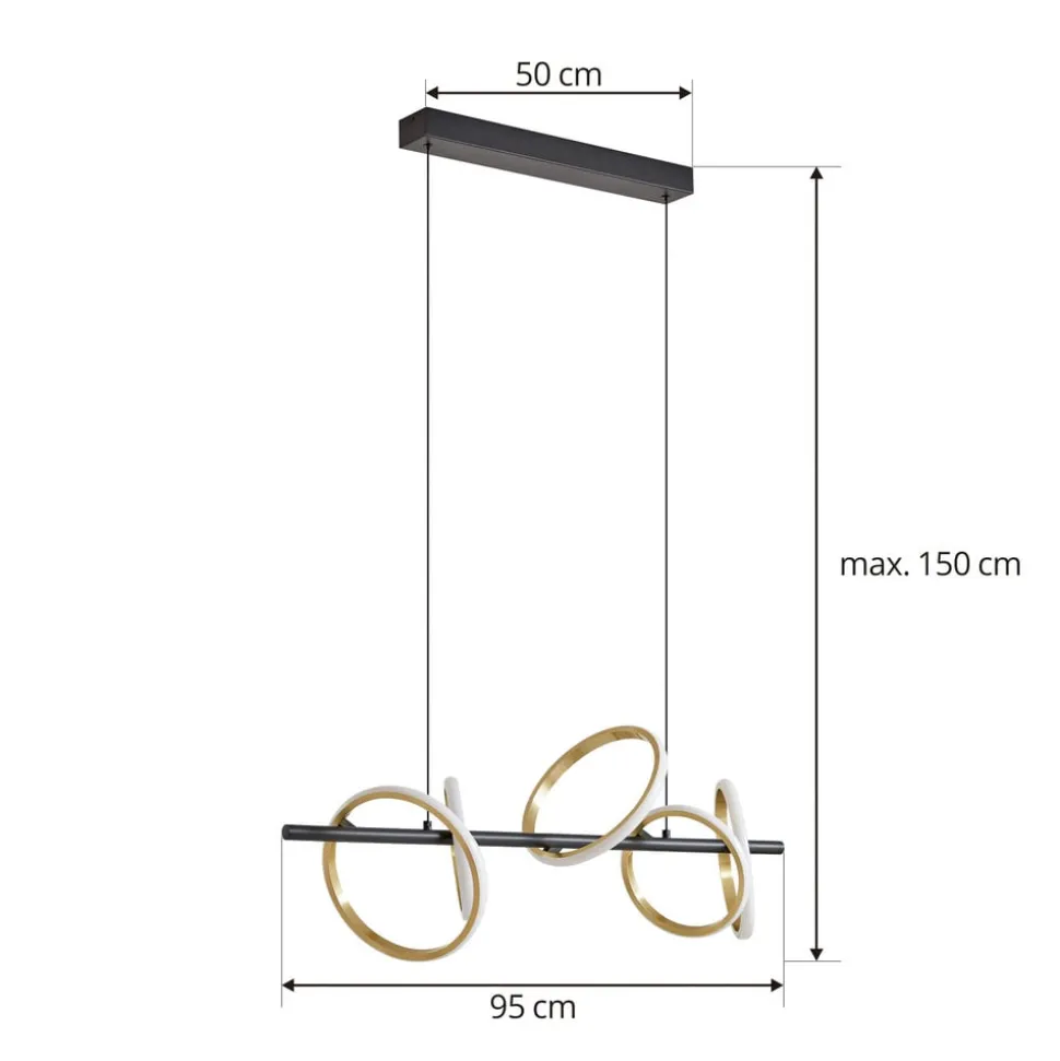 Madu LED-pendellampe med gylne lyselementer Madu LED-pendellampen med ringformede lyselementer er en moderne og energibesparende belysningsløsning for hjemmet. På en svart stang er det montert flere ringer som imponerer med sitt elegante, gylne utseende. På utsiden sitter LED-lampene under en hvit skjerm som en lysstripe og avgir et universelt hvitt lys hele veien rundt. Lyskildenes ulike plassering gir pendellampen et spennende og individuelt uttrykk, og den er spesielt attraktiv over et spisebord.
