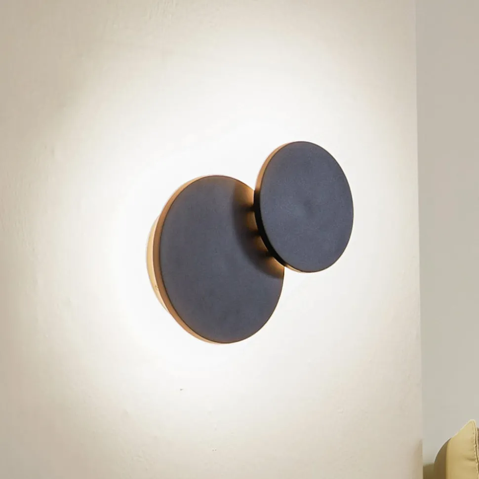 Rund Elrik LED-vegglampe bestående av to elementer Elrik LED-vegglampen har et enkelt utseende og består av to runde elementer i forskjellige størrelser. Designet er minimalistisk og holdt i en enhetlig svart farge. På baksiden er det integrert en LED-modul som sørger for at det varmhvite lyset sendes ut mot veggen. Det ugjennomsiktige metallet skaper indirekte belysning som sendes ut via kanten av kroppen – kan også brukes som taklampe
