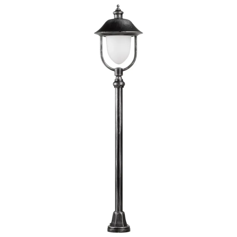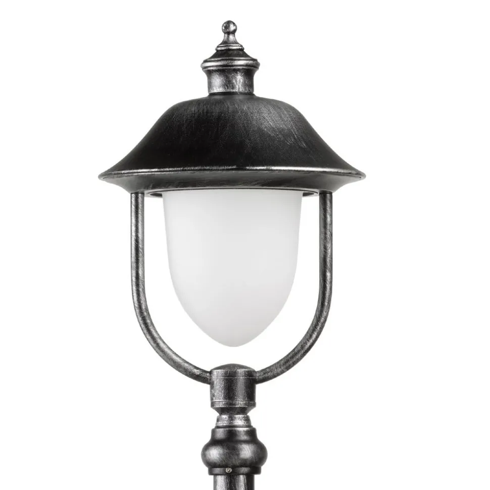Stibelysning i aluminium Perdita i svart-sølv Perdita er en stibelysning som ikke bare lyser opp hagestier, innkjørsler, parker osv. i mørket takket være det attraktive designet, men som også pynter opp på dagtid. Det hvite armaturglasset holdes oppe av en vakkert formet og dekorert baldakin og henger fritt i den buede rammen. Lyset fra glødelampen, sparepæren eller LED-lampen som kan settes inn, skinner jevnt og blendingsfritt gjennom glasset.