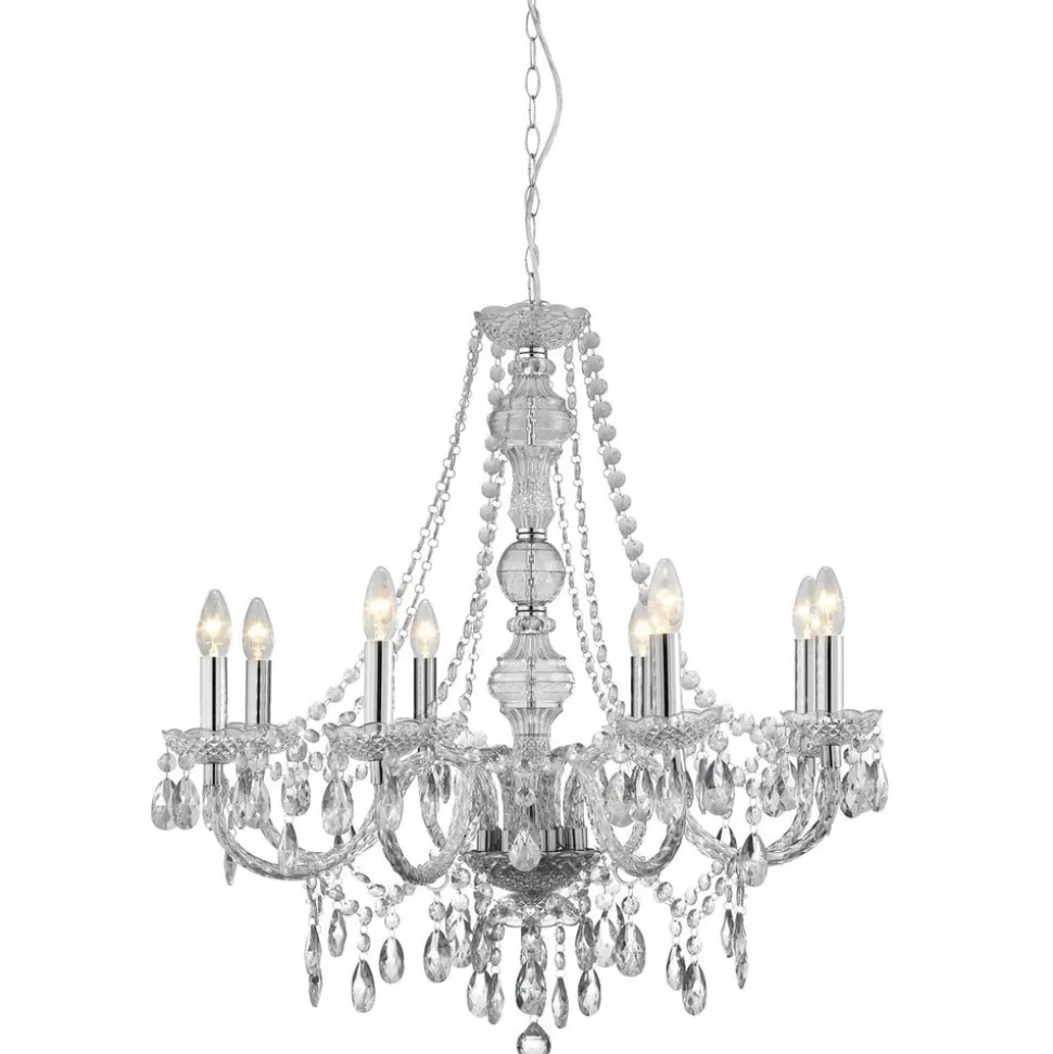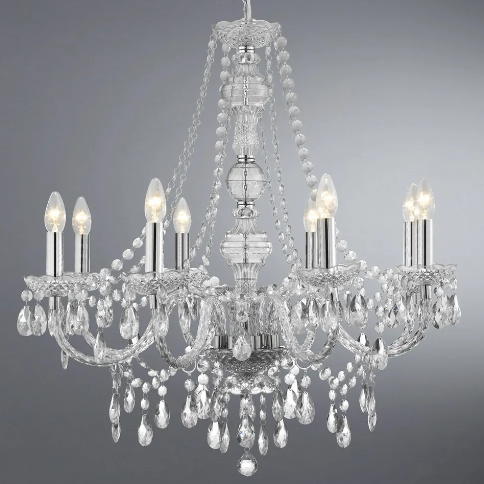 Marie Therese- lysekrone med åtte flammer i sin kombinasjon av forkromet metall og klart glass er fantastisk og staselig. Lysekronens oppheng ble dekorert med mange glasselementer, og lampearmene er også omsluttet av klart glass, utstyrt med klare lysplater og dekorert med mange kjeder med runde, flate elementer og dråper laget av kuttet krystallglass.