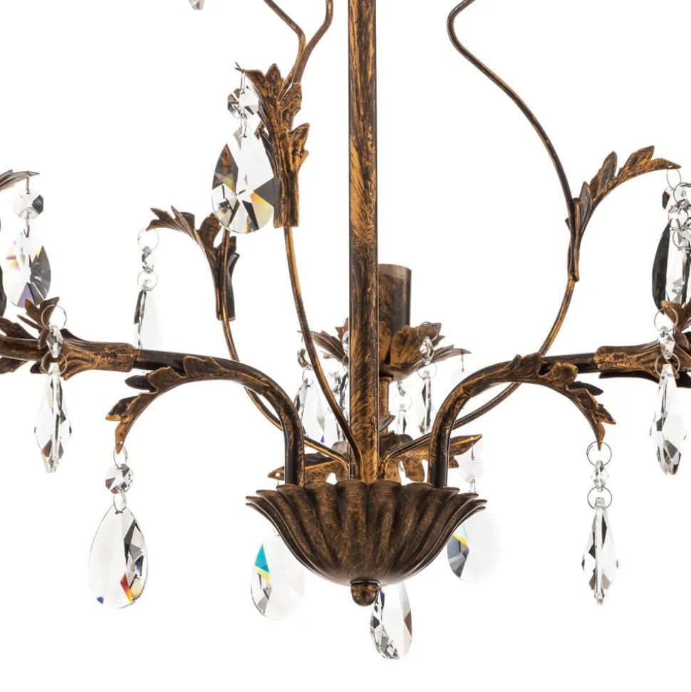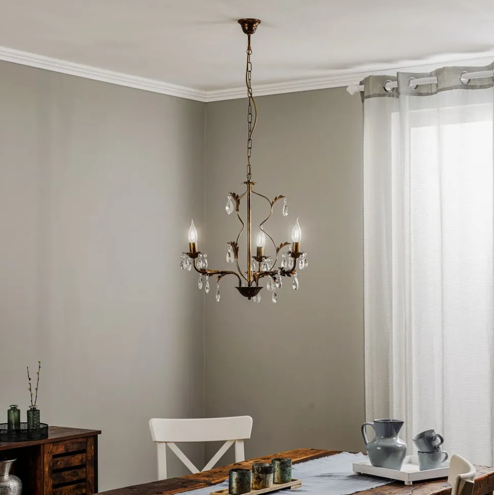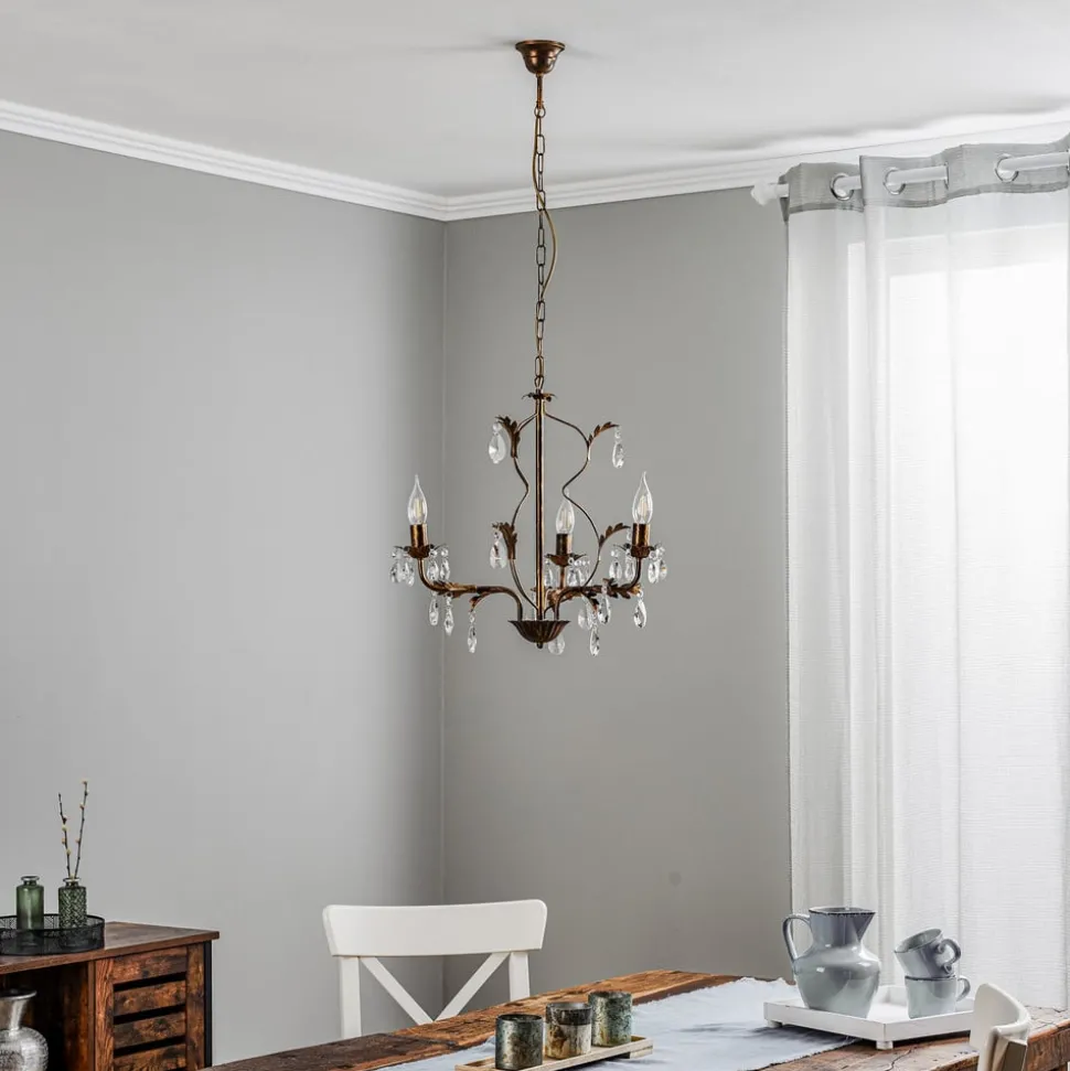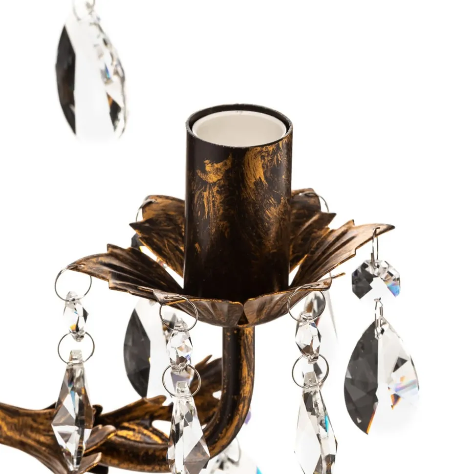 Lysekrone Teresa kombinerer antikk eleganse med moderne funksjonalitet og er laget av høykvalitets smijern og glitrende K9-krystallglass. Konstruksjonen med 3 lyskilder sørger for en jevn og imponerende lysfordeling som skaper en stilig atmosfære både i stuen og spisestuen. Kombinasjonen av antikk bronsefarge og klart krystallglass gir ethvert rom et snev av luksus og raffinement.
