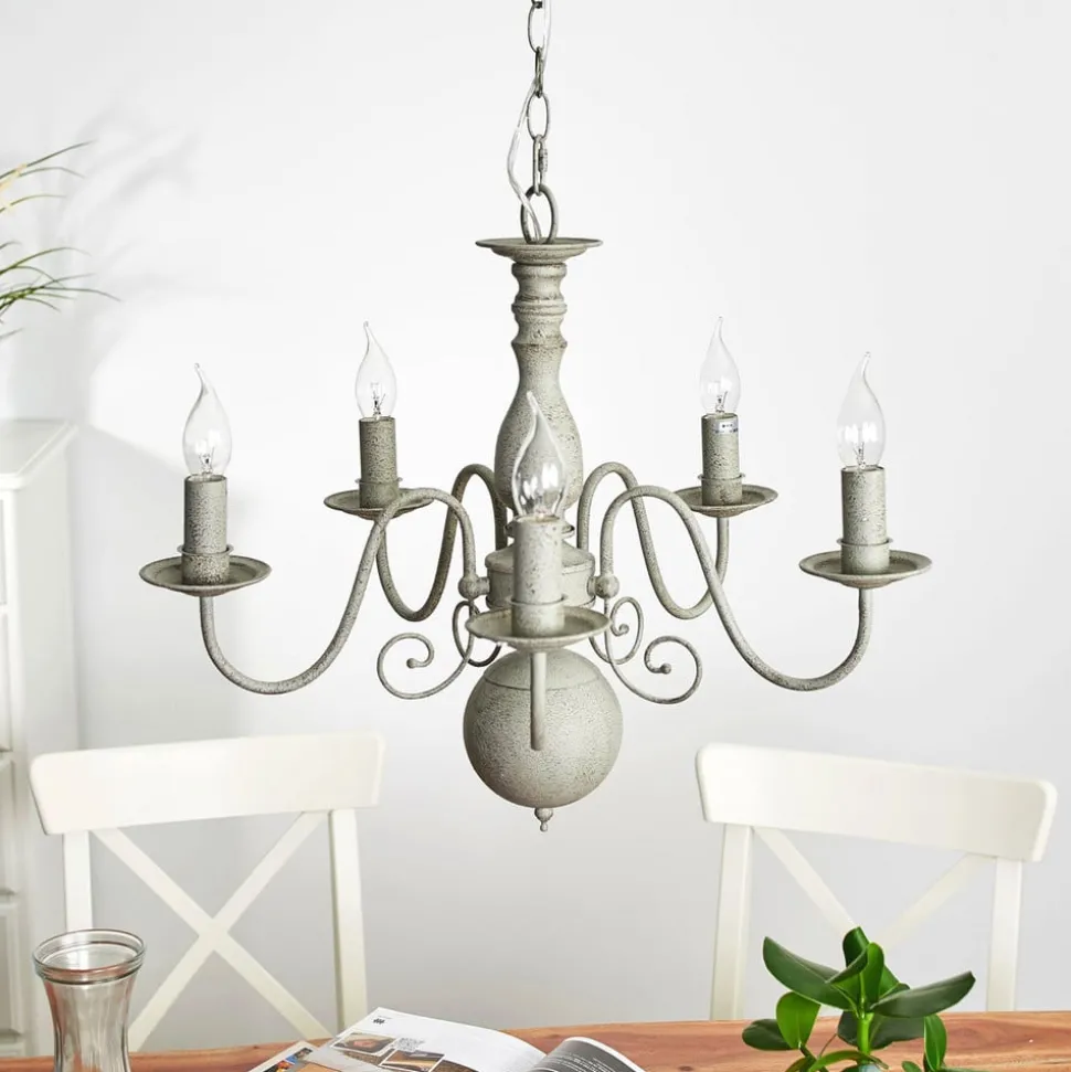 Den enkle fargegivningen står i kontrast til det morsomme designet på stålstativet hos den åttepunkts lysekronen Greythorne Dessuten har gråfargen et flott strukturmønster. Fem mignonpærer gir stemningsfull belysning og sørger for en behagelig atmosfære. Denne vakre lysekronen kan kombineres med forskjellige bostiler og tar seg godt ut overalt, enten den brukes som generell belysning i stuen eller skal iscenesette en stor gang.