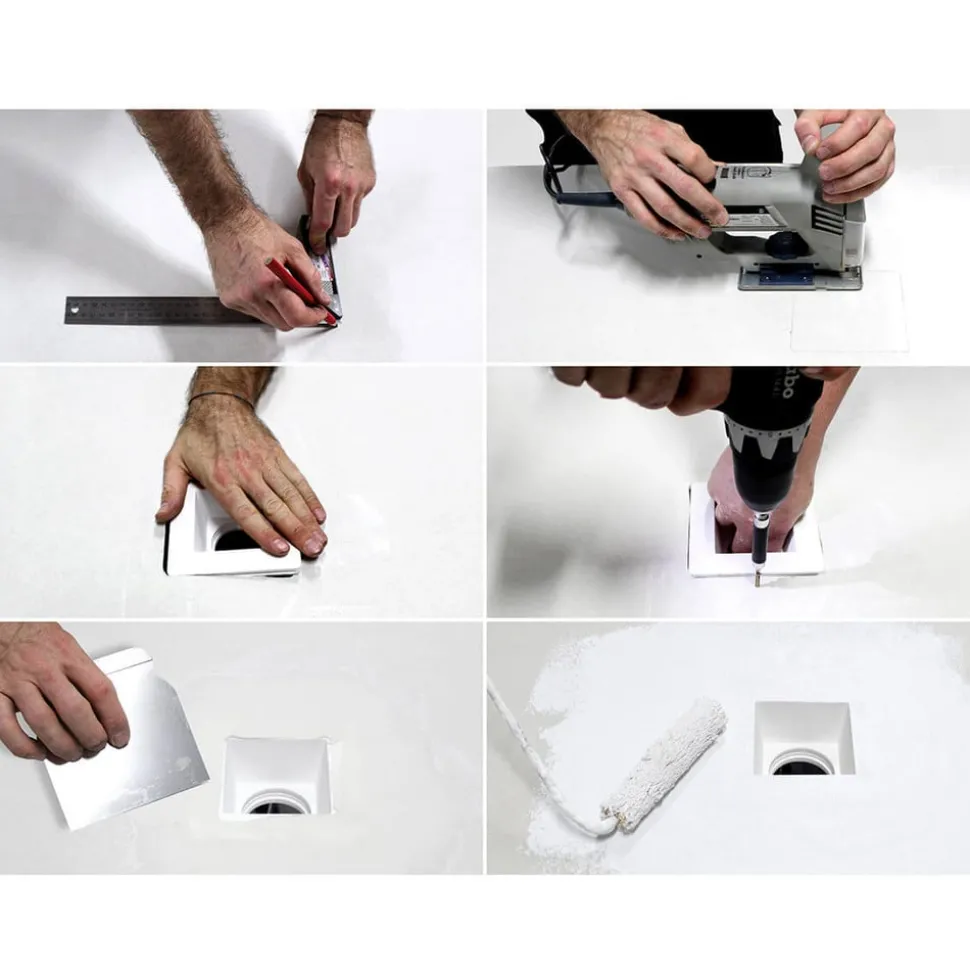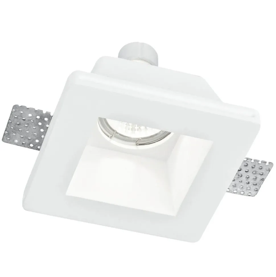 Ghost – kvadratisk innfelt spot i gips – kan males over Fordi Ghost innfelt spot er laget av gips, kan den enkelt males over, slik at innfelt takspot kan integreres helt i flukt med taket, og bare takutsparingen og lyskilden er synlig. Lyset fra pæren sendes ut i en vinkel på 45°. Det kan brukes en halogenpære GU10 på maks. 35 W eller en tilsvarende LED-pære med GU10-sokkel.