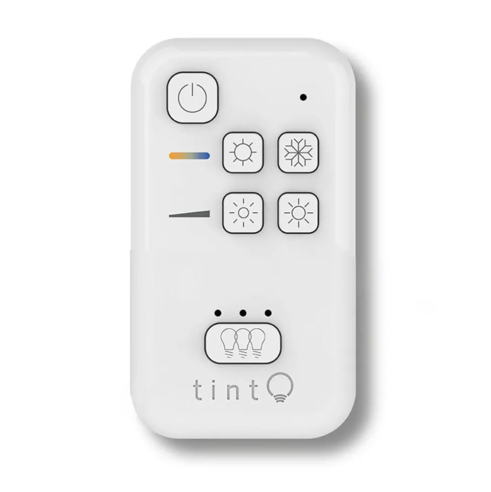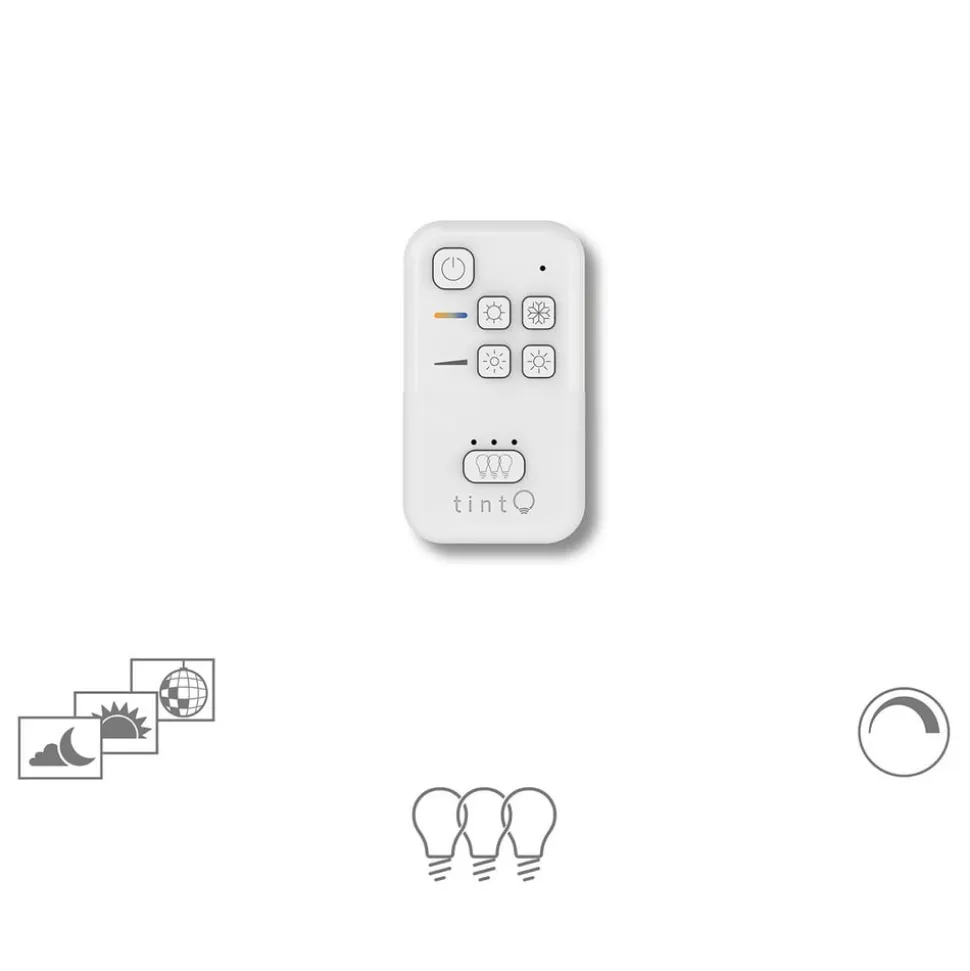 Müller Licht tint fjernkontroll – perfekt for styring av tint «white»-produkter Den lille, kompakte fjernkontrollen fra tint-serien kan brukes til å styre alle egnede lyskilder og lamper med hvit lysstyring, dvs. såkalte tint «white»-produkter. Enten du vil justere hvitfargen fra varm til kald, dempe lyset eller til og med gruppere flere lamper, er alt dette mulig med den lille fjernkontrollen i tillegg til klassisk av- og påkobling. De mange valgmulighetene er svært praktiske og gjør betjeningen av smart tint-lampene både enkel og intuitiv. tint-fjernkontrollen leveres med et praktisk veggfeste som er magnetisk og kan festes nesten hvor som helst. Dermed er den lille kontrollenheten alltid tilgjengelig og kan til og med brukes som veggbryter.