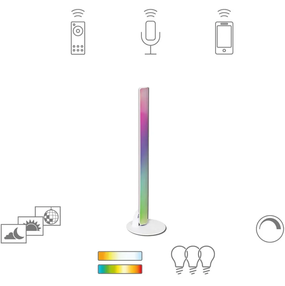 Smart styrbar LED-lyslist Talpa – allsidig i bruk Den moderne LED-lyslisten Talpa er enkel å betjene og fleksibel i bruk. Som klassisk underskapslampe eller som praktisk og fleksibel frittstående lampe kan Talpa brukes nesten hvor som helst. Som klassisk underskapslampe gir den ideelt arbeidslys, for eksempel på kjøkkenet, ettersom det hvite lysspekteret kan varieres mellom varmhvitt og dagslys. Takket være RGB-lysdiodene er det også mulig å velge mellom en rekke farger. Talpa tilbyr dermed farget lys for enhver anledning. LED-lyslisten kan også brukes som frittstående lys, ettersom et avtakbart stativ er inkludert i leveransen. Det betyr at Talpa også kan brukes som ekstra belysning i stuen eller for eksempel som et stilig lys ved siden av sengen. Talpa kan styres med en egnet fjernkontroll. Når den integreres i et egnet smarthussystem, kan den også styres via din egen smarttelefon eller en egnet stemmeassistent. Funksjoner/kompatibilitet: – kan styres via en egnet fjernkontroll med fargetone (se tilbehør) – kan styres via app basert på ZigBee radiostandard 3.0 – kompatibel med Alexa stemmeassistenter (Amazon) – kan integreres i ZigBee-baserte smarthussystemer, for eksempel med Philips Hue, Osram Lightify etc. – individuell stemningsbelysning i hvitt (1800 til 6500 K) – farget lys (RGB) – dimbar i alle valgte lysfarger