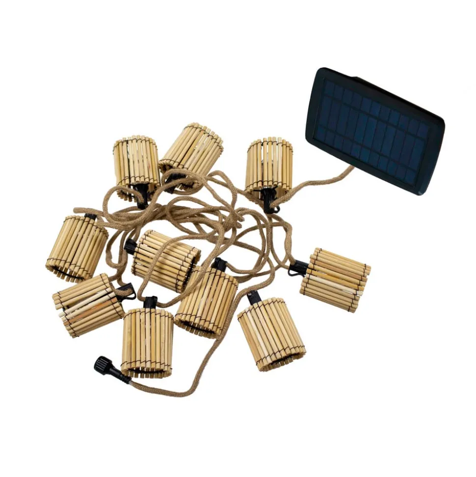 Okinawa utendørs lyskjede – oppladbar via solcellepanel eller USB-tilkobling Den 10-lampers Okinawa solcellelyskjeden med bambusskjermer er en vakker dekorasjon for uteområder som terrassen eller balkongen. Kjeden leveres med ti LED-pærer med E12-sokkel og to ekstra pærer. Kan brukes utendørs takket være IP44-klassifiseringen (sprutsikker). Lyskjeden kan lades enten via det integrerte solcellepanelet eller via den innebygde USB-porten. En ladekabel med nettadapter er ikke inkludert i leveransen.