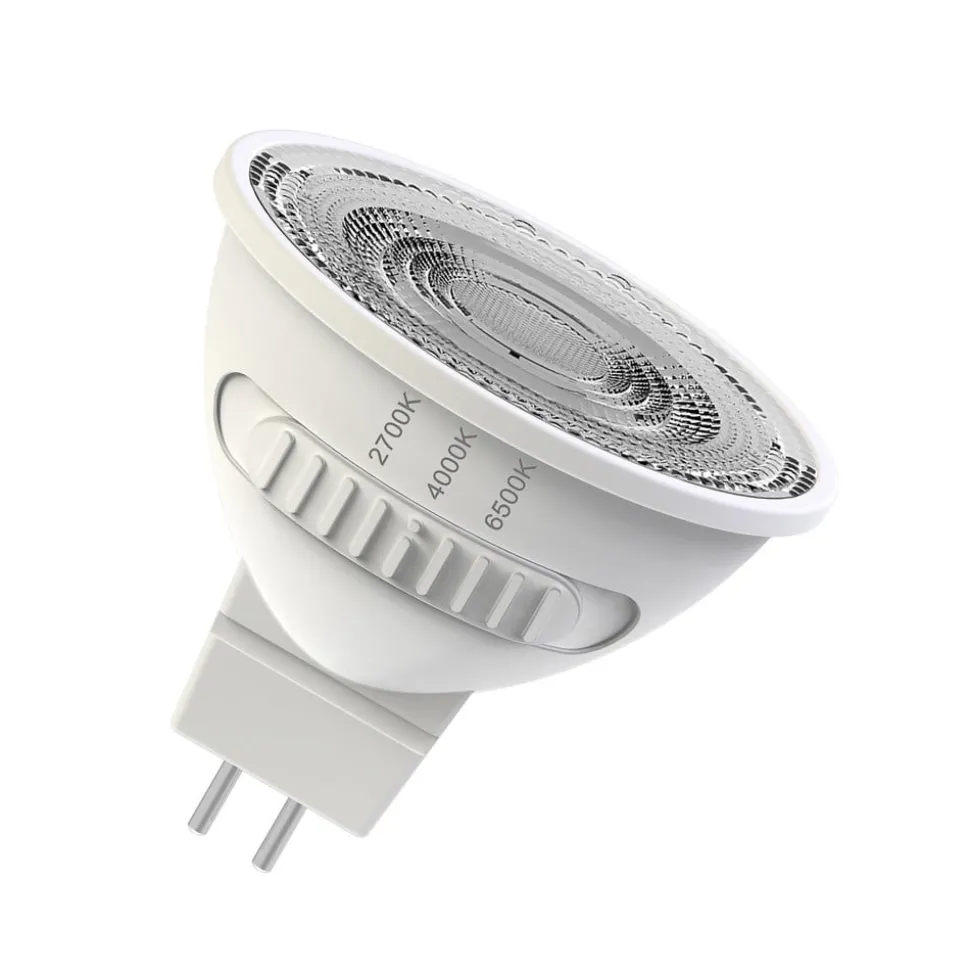 Fargetemperatur justerbar i 3 trinn (CCT): OSRAM LED-reflektor spot GU5.3, 12 V AC / DC, 5,6 W, 36 ° LED-reflektoren for lavspenningsarmaturer leveres med justerbar fargetemperatur og gir umiddelbart 100 % lys uten oppvarmingstid. Fargetemperaturen kan justeres via en integrert bryter fra varmhvitt lys til universalhvitt lys og dagslyshvitt lys. Denne reflektoren gir kraftig lys og er ideell for rask utskifting av konvensjonelle halogenlamper. Tekniske egenskaper: – Justerbar fargetemperatur (2 700 K / 4 000 K / 6 500 K) via integrert bryter – Sammenligningsverdi: 45 W (i forhold til konvensjonelle lamper) på bare 5,6 W – God koblingsstabilitet: 100 000 koblingssykluser Merknader: – Kun egnet for lavspenningslamper (12 V AC / DC) – Ikke dimmbar
