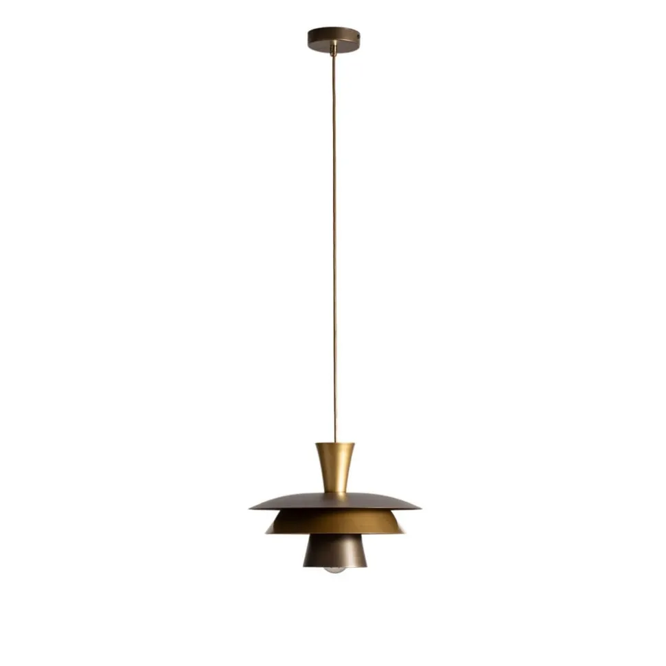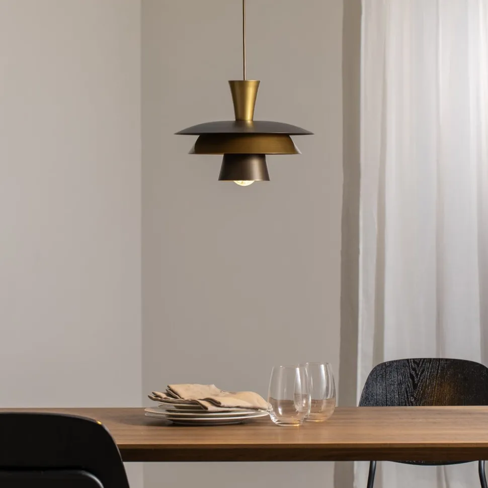 Pendellampe Plato i titan og gullfarget design kombinerer tidløs eleganse med moderne funksjonalitet. Denne lampen er laget av høykvalitets stål og er en robust og holdbar belysningsløsning som passer perfekt til stuer, spisestuer og kjøkken. Den harmoniske fargekombinasjonen av titan og gull gir ethvert rom en stilig og varm atmosfære.