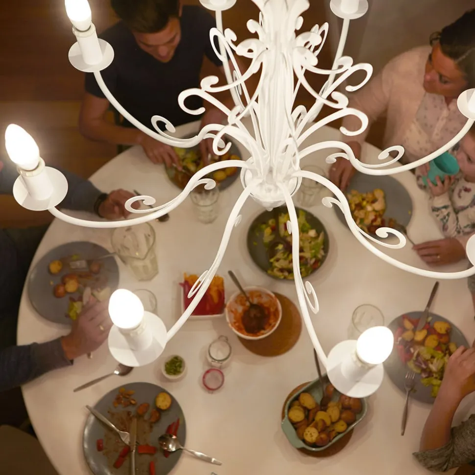 Lyslampen med effektiv LED-teknologi gir varmt hvitt lys, som lyser opp rommet umiddelbart etter at du har slått på og ikke krever en oppvarmingsfase. Det varme hvite lyset skaper en hjemmekoselig og veldig koselig atmosfære der fargegjengivelse også er veldig god, slik at fargene fremstår veldig naturtro og livlige. Med sin design og matte overflate er lyset perfekt for både åpne og lukkede lys, der skjønnhet og eleganse er spesielt vist med fordel i lysekroner.