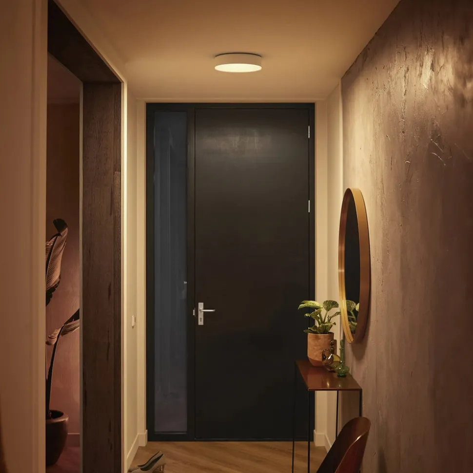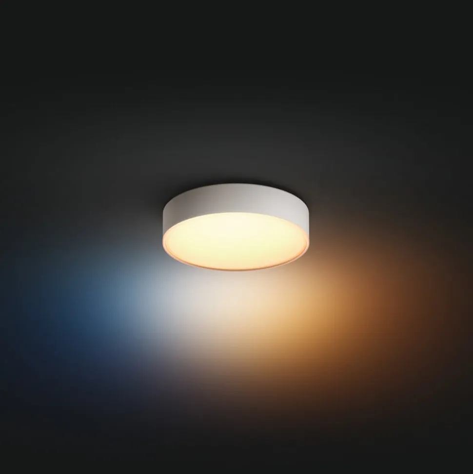 Den runde LED-taklampe Hue Enrave tilbyr sterkt lys med store områder. Enrave tilbyr riktig lys til enhver tid på døgnet, enten det er i stuen, gangen eller soveområdet, med justerbar lysstyrke og hvittoner i spekteret fra varmhvitt til dagslys . Takket være den medfølgende dimmerbryteren kan taklampe slås av og på og dimmes direkte. Alternativt kan lyset også styres via Bluetooth med din egen smarttelefon, uten behov for ekstra enheter. Smart integrasjon i et eksisterende Philips Hue smarthjemsystem via Hue Bridge (se tilbehør) er også mulig.