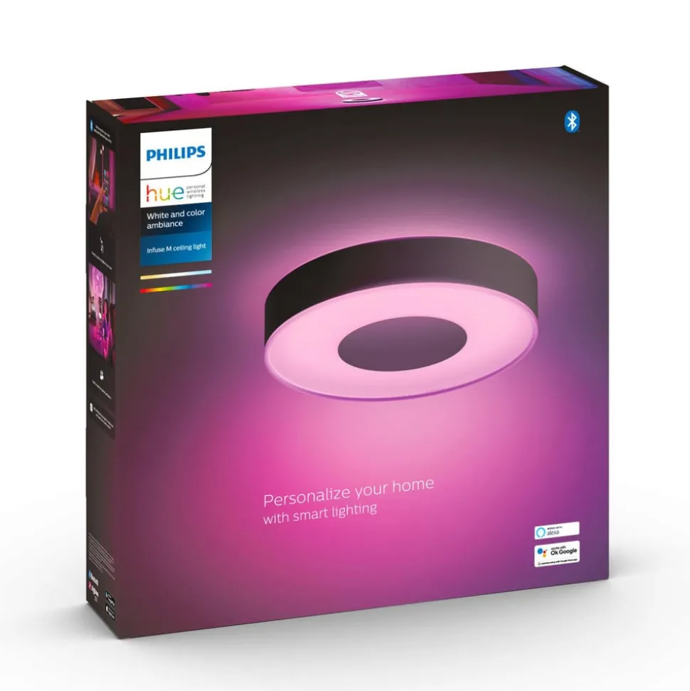 Den moderne og elegante Infuse LED-taklampe gir omfattende rombelysning med direkte lys og takbelysning. Den er utformet i en rund form, med en omsluttende ramme på siden og et sentralt panel på undersiden. I tillegg til et hvitt lys i forskjellige fargetemperaturer, som varmhvitt eller dagslys , tilbyr lampen også farget lys, slik at en lang rekke lysscenarier er mulig; lysstyrken kan også justeres når som helst. Lyset styres enten direkte via Bluetooth med smarttelefon/nettbrett eller integrert i et smarthjemsystem som Philips Hue via en ZigBee -bro.