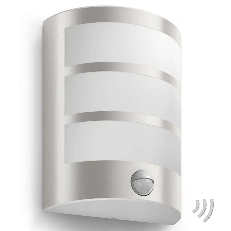Den værbestandige LED-vegglampen Python er utstyrt med en bevegelsessensor som registrerer alle bevegelser i en avstand på 10 meter og en registreringsvinkel på 110°. Så snart dette skjer, slås lampen automatisk på og begynner å spre sin sjarm i omgivelsene, for ikke bare lysbildet er helt fortryllende, som lampen oppnår ved hjelp av de forskjellige lysåpningene, men også det stilige utseendet den er designet i. Lysvarigheten kan stilles inn fra 5 sekunder til 12 minutter, etter ønske. Den innebygde LED-teknologien garanterer dessuten strømsparende drift, for med bare 6 watt energi produserer den en lysfluks på 600 lumen.