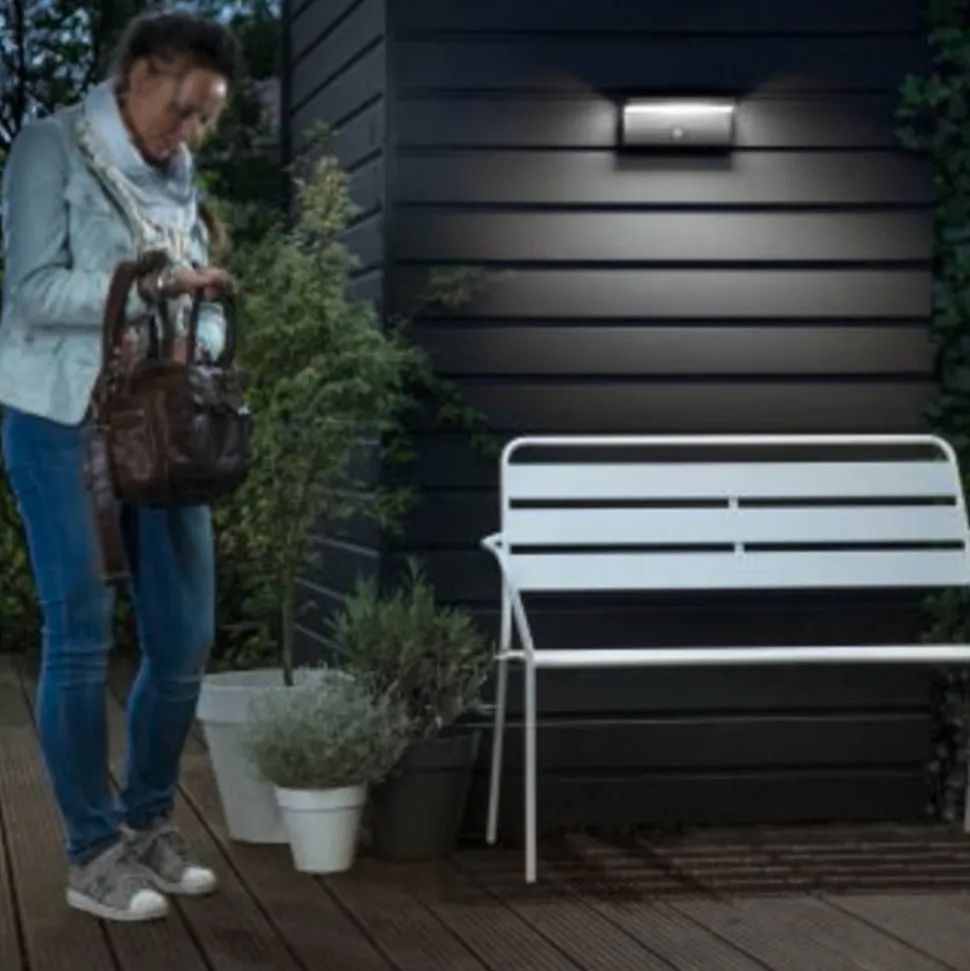 Utendørs vegglampe Bustan IR fra myGarden-kolleksjonen er laget av antrasittlakkert aluminium og en diffusor av plast, og er utstyrt med en sensor som automatisk slår på det nedadrettede lyset fra de integrerte, universalhvite LED-lampene når det er behov for det. Takket være den innebygde LED-teknologien og bearbeidelsen av høykvalitetsmaterialer er dette en svært holdbar lyskilde for mange utendørsområder.