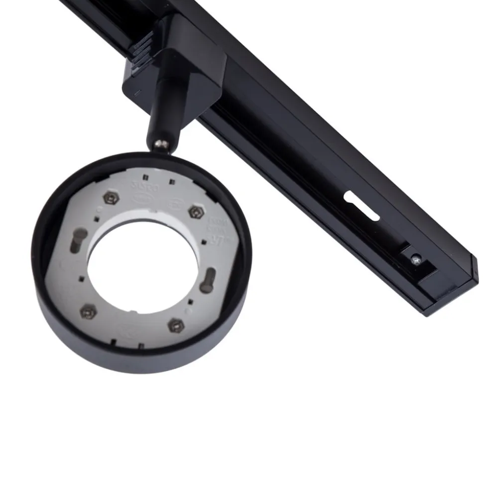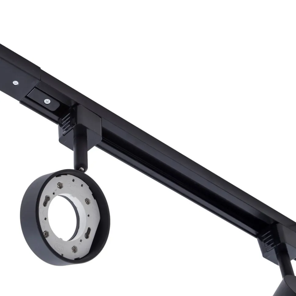 Svart skinnesystem Jardani med bevegelige spotlights Jardani er et moderne skinnesystem i aluminium. Det har en svart overflate og består av tre spotlights og en strømskinne. Spotlightene kan utstyres med GX53 lyskilder og gir mulighet for fritt valg av lysfarge – perfekt tilpasset personlige behov. I tillegg kan spottene roteres 350° og vippes 90°, slik at lysstrålen kan rettes etter behov. Jardani er ideell for belysning av kommersielle områder.