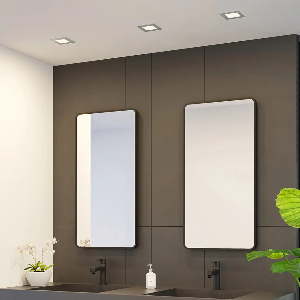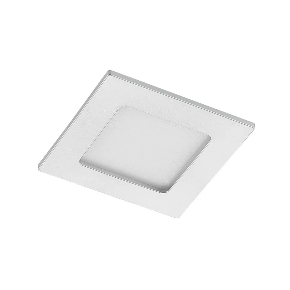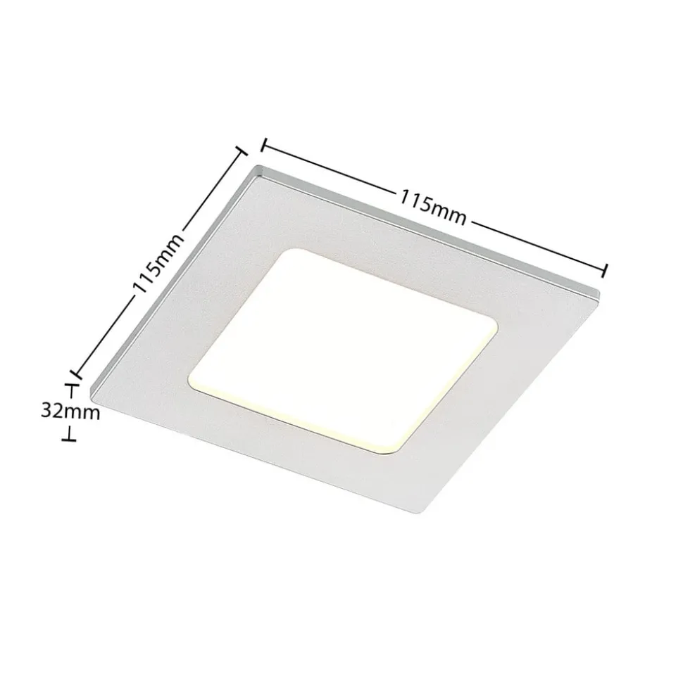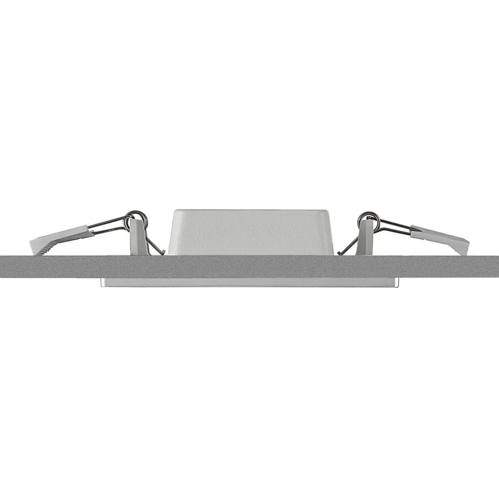 Sølvfarget LED innfelt spotlight Helina i kvadratisk form, IP44, dimbar, forhåndsinnstillbar lysfarge Helina har en kvadratisk grunnform og er beregnet for montering i taket. Designet med den kantede, sølvfargede rammen har et behagelig enkelt og tidløst uttrykk, noe som gjør at armaturen kan brukes på mange forskjellige måter, også i kommersielle miljøer. Armaturhuset er laget av robust polykarbonat, og det faktum at Helina også kan brukes i fuktige rom takket være kapslingsgrad IP44, øker anvendelsesmulighetene. Et annet pluss er at lysfargen også kan stilles inn etter behov; det finnes en DIP-bryter på armaturhuset som gjør det mulig å velge fargetemperatur før installasjon. Dimmbarheten er også garantert hvis en ekstern dimmer er tilgjengelig – DIP-bryter for forhåndsinnstilling av lysfarge – IP44 for bad og fuktige rom – Robust polykarbonathus og aluminiumsklemmer for enkel installasjon – Ekstern dimming