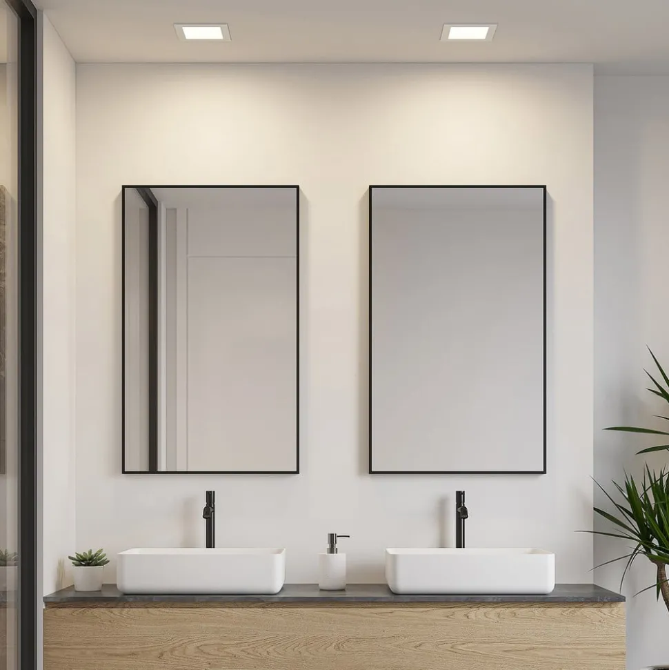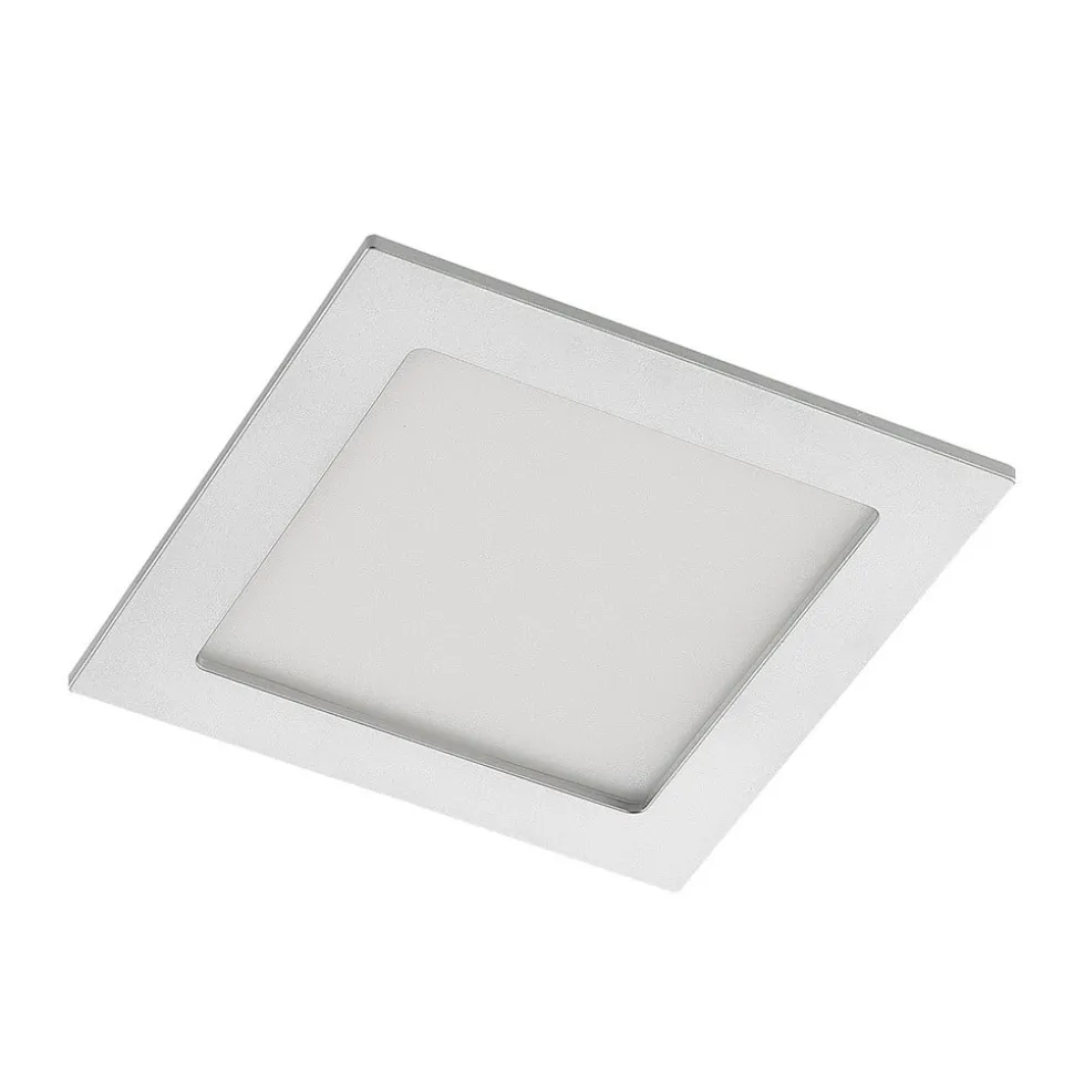 Sølvfarget LED innfelt spotlight Helina i kvadratisk form, IP44, dimbar, forhåndsinnstillbar lysfarge Helina har en kvadratisk grunnform og er beregnet for montering i taket. Designet med den kantede, sølvfargede rammen har et behagelig enkelt og tidløst uttrykk, noe som gjør at armaturen kan brukes på mange forskjellige måter, også i kommersielle miljøer. Armaturhuset er laget av robust polykarbonat, og det faktum at Helina også kan brukes i fuktige rom takket være kapslingsgrad IP44, øker anvendelsesmulighetene. Et annet pluss er at lysfargen også kan stilles inn etter behov; det finnes en DIP-bryter på armaturhuset som gjør det mulig å velge fargetemperatur før installasjon. Dimmbarheten er også garantert hvis en ekstern dimmer er tilgjengelig – DIP-bryter for forhåndsinnstilling av lysfarge – IP44 for bad og fuktige rom – Robust polykarbonathus og aluminiumsklemmer for enkel installasjon – Ekstern dimming