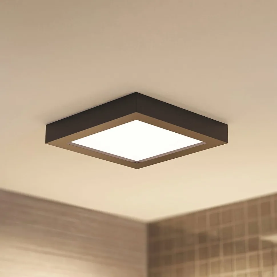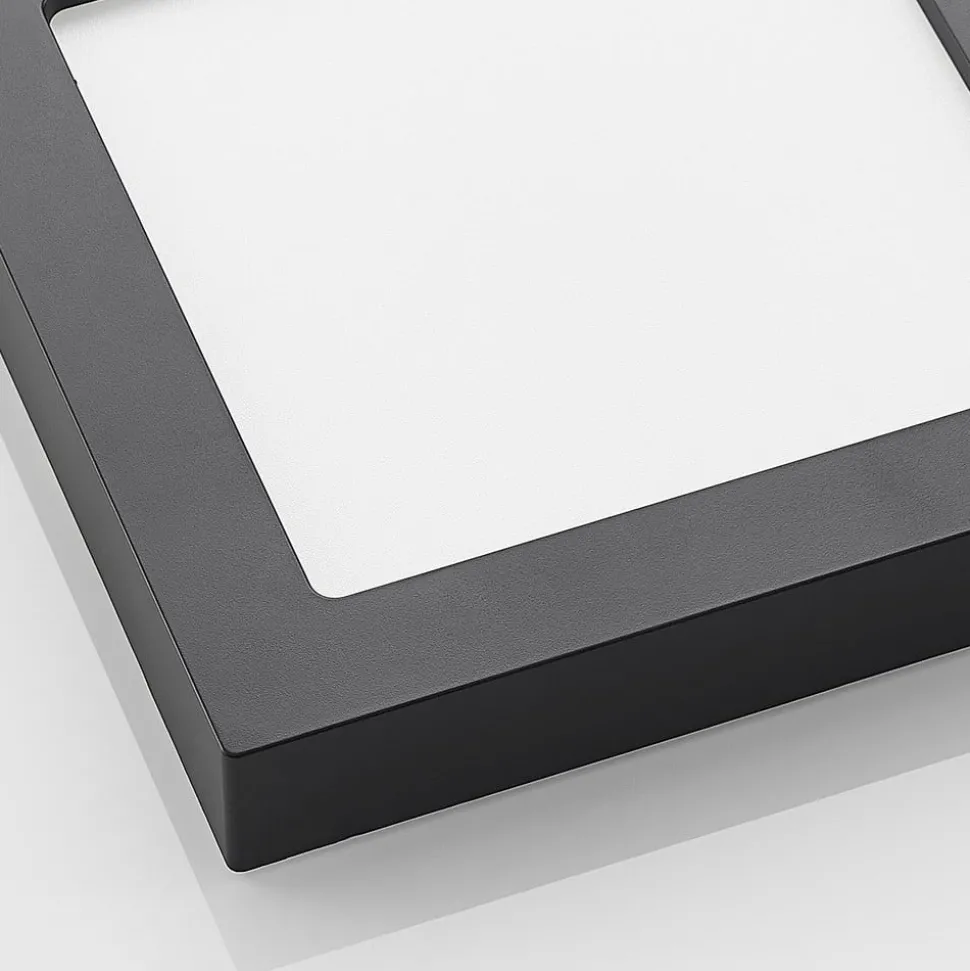 Kvadratisk LED-taklampe Alette med CCT og dimmerfunksjon, IP44 LED-taklampen Alette er laget av aluminium og plast. Det kantede lampekabinettet har en svart overflatefinish og et iøynefallende og moderne utseende. Designet kan integreres i ulike interiører og ser veldig stilig ut. Lysstyrken på denne lampen kan justeres individuelt ved hjelp av en ekstern dimmer (leading edge phase control). Det finnes også en DIP-bryter på armaturhuset som kan brukes til å forhåndsjustere lysfargen i flere trinn (3 000 K, 4 000 K og 6 000 K). Den har også en IP44-beskyttelsesgrad, noe som betyr at lampen også kan brukes på badet. Den egner seg for bruk både i privat og kommersiell sektor. Tekniske data: – Dimbar (forkantfasestyring) – CCT-funksjon via DIP-bryter: 3 000 K / 4 000 K / 6 000 K – IP44-beskyttelsesgrad – 120° spredningsvinkel