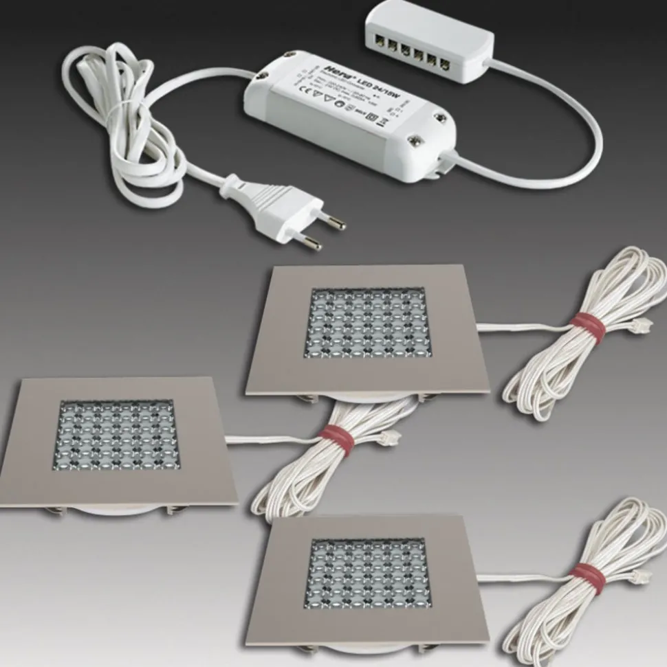Energibesparende, ekstremt holdbar LED innfelt spot med en gjennomsnittlig levetid på opptil 30 000 timer, i sett med 3 stk. inkludert transformator og med 2,5 m lang tilkoblingsledning. Huset er laget av høykvalitets plast og har et rustfritt stålutseende. Innbyggingsdiameteren er 6,8 cm, innbyggingsdybden er 1,3 cm.