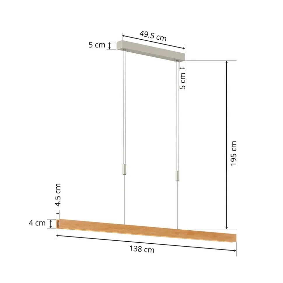 Høydejusterbar LED-pendellampe i tre, Alin, med lys oppover og nedover, beste kvalitet, produsert i Tyskland To massive eiketreelementer, som er festet på siden av et LED-lyselement, danner rammen eller skjermen til LED-pendellampen Alin og skaper et naturlig uttrykk i rommet. Fordi lyset er rettet både oppover og nedover, har den høydejusterbare LED-pendellampen integrert opp- og nedadrettet belysning, noe som gir et behagelig og naturlig lys i hele rommet. Med sin avlange form er Alin ideell til bruk over et bord, enten det er i spisestuen eller over arbeidsområdet. De integrerte, varmhvite LED-lampene gir svært effektiv belysning med høy grunnlysstyrke. Ved behov kan du montere en ekstern dimmer eller bruke den eksisterende dimmeren, slik at du kan tilpasse lysintensiteten til dine egne behov ved hjelp av kontinuerlig variasjon. Høyden på opphenget – en like brukervennlig funksjon – kan justeres fra 105 cm til 195 cm med bare noen få enkle trinn, ettersom en kabeltrekkmekanisme er integrert.