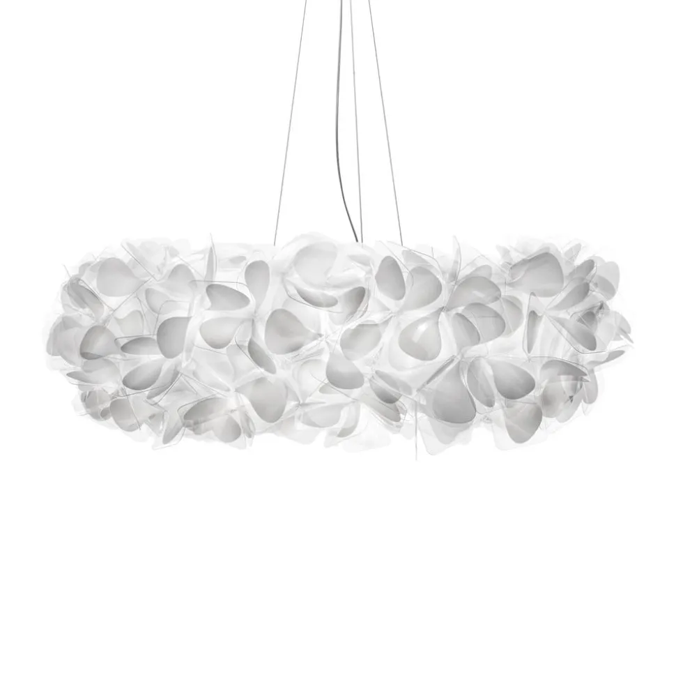 Fascinerende hengelampe Clizia Mama Non Mama med rød kabelEt uttrykk for ren skjønnhet når det gjelder utseende og lysutslipp formidles av hengelampen Clizia Mama Non Mama. Som kronblader danner utallige elementer, manuelt koblet sammen med Cristalflex®-kontakter, en skjerm som ser ut som en lysende bukett og skaper en uforlignelig vakker lysatmosfære. En hengende lampe designet av Adriano Rachele og produsert av den italienske belysningsprodusenten Slamp, grunnlagt i 1994 av Roberto Ziliani, som er ideell for atmosfærisk omgivelses- og områdebelysning i stuer og soverom.Cristalflex® – gjennomsiktig som krystall, men like lett, fleksibel og uknuselig som polykarbonat, er et materiale som egner seg til produksjon av lette belysningskreasjoner for både privat sektor og hotellbransjen. Det gjennomsiktige teknopolymermaterialet har et kronbladtrykk. Adriano Rachele, den kreative hjernen bak designen av Clizia, har jobbet i forskningsavdelingen siden 2007
