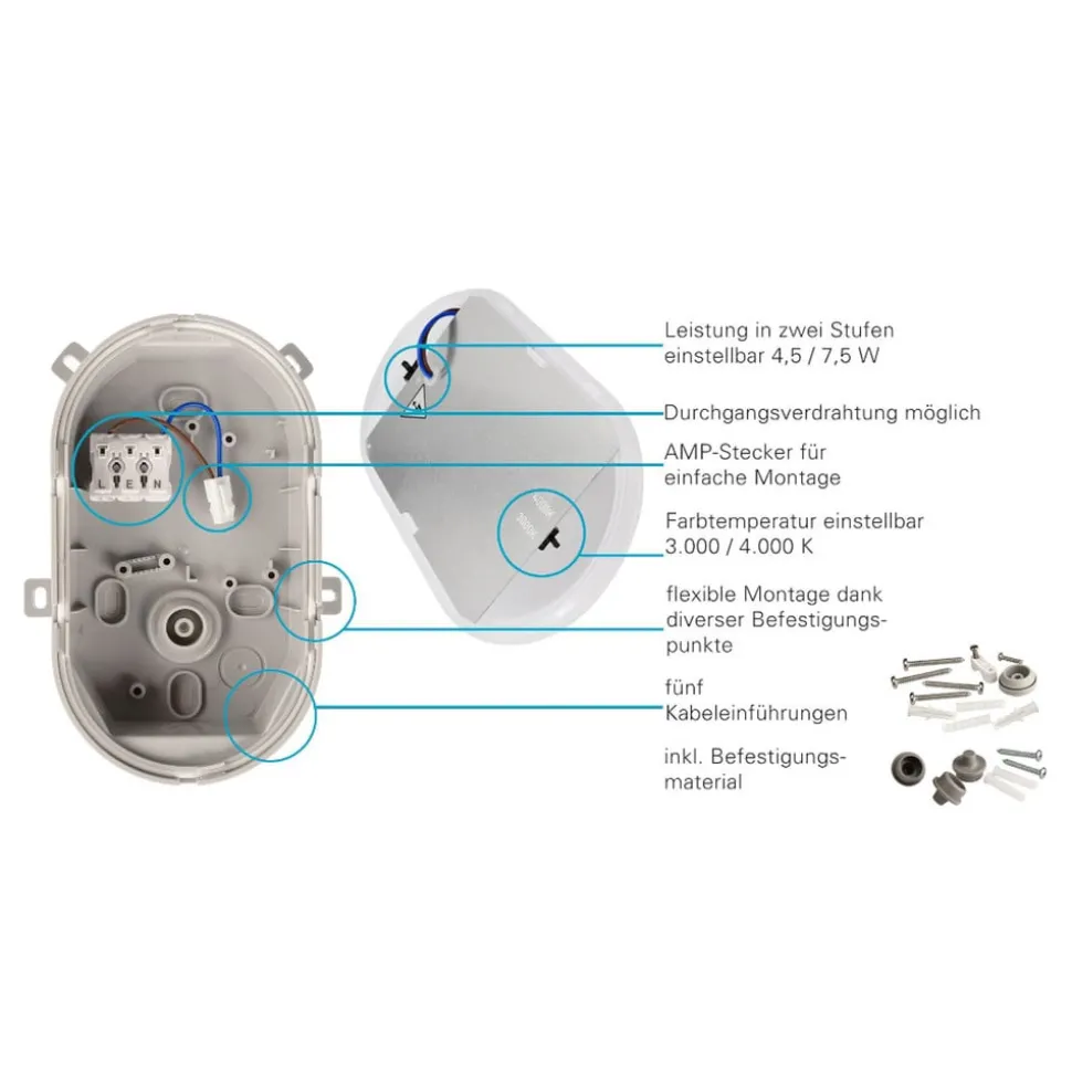 Fleksibel og allsidig Sorato LED-vegglampe for utendørs bruk Sotano-serien er en klassisk kjellerlampe med moderne design og LED-teknologi. Armaturen er den perfekte løsningen for et bredt spekter av bruksområder og imponerer med sin fleksibilitet og robusthet. Lampen til våtrom er spesielt fleksibel takket være CCT-bryteren på 3000 K / 4000 K og effektbryteren på 4,5 W / 7,5 W. Dette gjør det mulig å justere lysfarge og effekt etter behov og bruksområde. Kabelinnføringene fra ulike sider muliggjør fleksibel og enkel installasjon. I tillegg er armaturen robust og holdbar takket være det IP54-beskyttede huset, slagfasthet opp til IK08 og imponerende levetid – Fargetemperatur justerbar (3 000 / 4 000 K) ved hjelp av skyvebryter – Effekt justerbar i 2 trinn (4,5 / 7,5 W) ved hjelp av skyvebryter – Fem kabelinnføringer på ulike sider 3 000 K: 4,5 W = 430 lm 7,5 W = 720 lm 4 000 K: 4,5 W = 450 lm 7,5 W = 750 lm