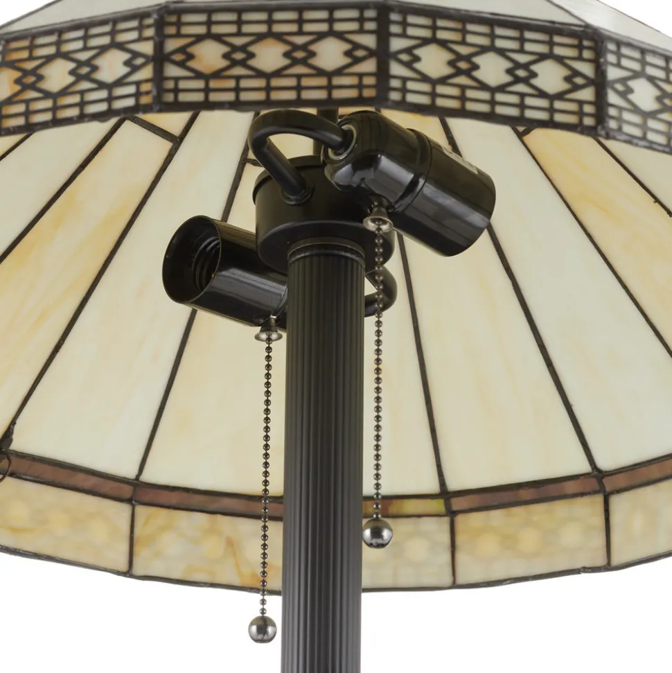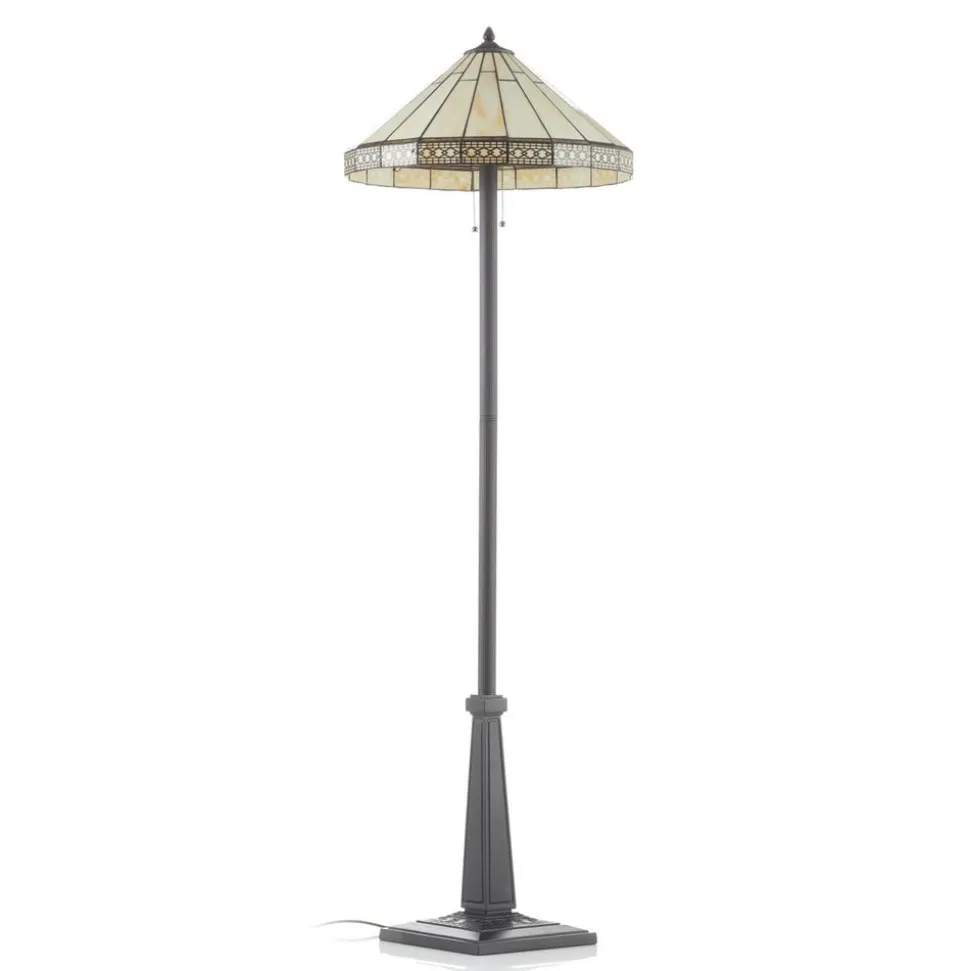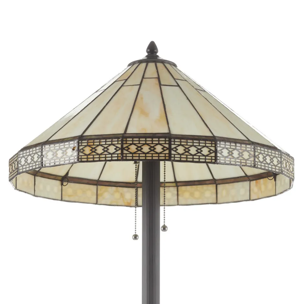 Bradley-gulvlampe i klassisk Tiffany-lookGlassskjermen i Tiffany-stil presenterer seg enkelt i kremfarget og mørkebrunt – den gir behagelig blendingsfri belysning. Kanten på glasskjermen er formet av en filigrandekorasjon – det dekorative høydepunktet i den imponerende gulvlampen. Med dette klassiske utseendet kan Bradley-gulvlampen integreres i mange oppholdsrom og bade dem i sitt varme lys.