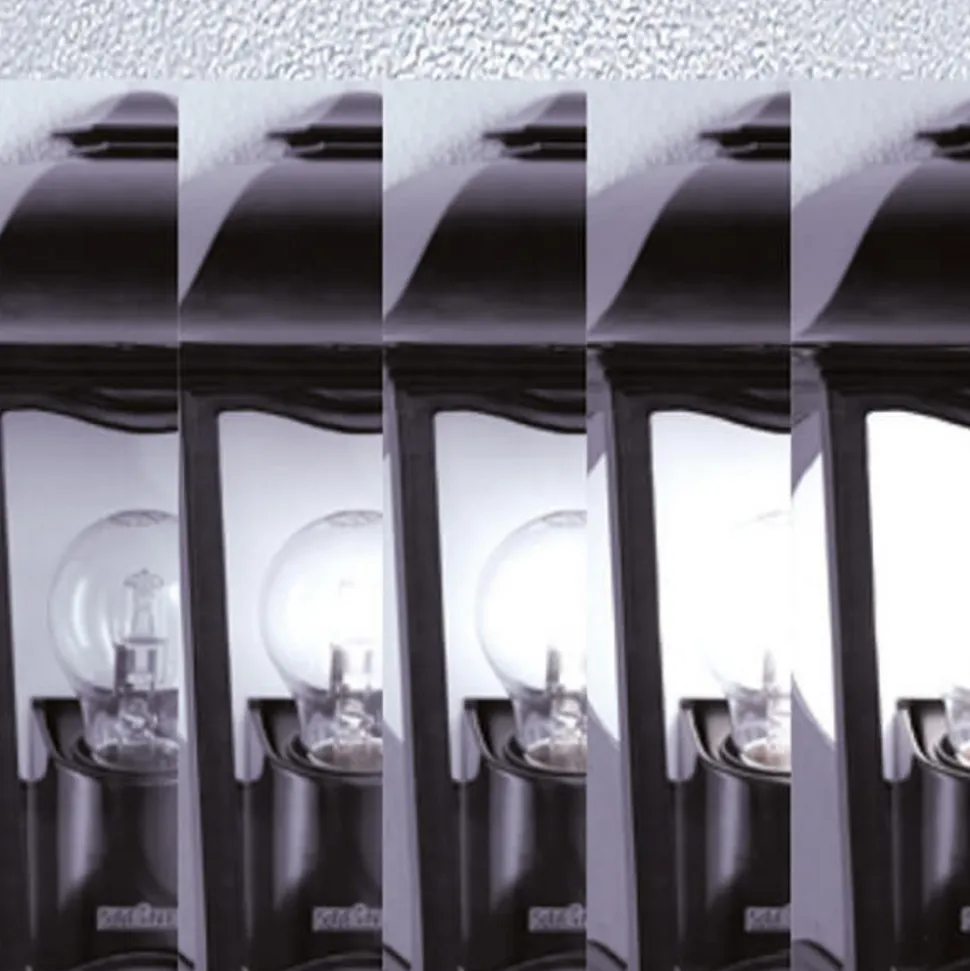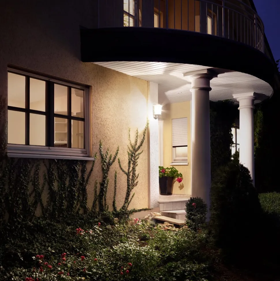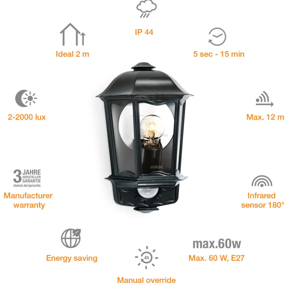Utendørs vegglampe L 190 S i klassisk lanterneform – utstyrt med bevegelsesdetektorUtebelysningen L 190 S er laget av rustfritt stål av høy kvalitet og utstyrt med STEINEL multisensorteknologi. En myk lysstart er integrert. Grunnlysstyrken justeres via Watt-o-matic (0-50 %). Ved bevegelse lyser lyset med full lysstyrke i den innstilte tiden. Kontinuerlig lys (4 timer) stilles inn via nettbryteren. Deteksjonsområdet kan begrenses ved hjelp av dekkplater (inkludert). Tider fra 5 sekunder til 15 minutter kan reguleres. Deteksjonsvinkelen er 180°, åpningsvinkelen 90°. Det er ikke mulig å bruke sparepærer i L 190 S.- Innstilling av rekkevidden ved å dreie multilinsen fra maks. 5 m til maks. 12 m- Lysets varighet samt skumringsterskel og lysstyrkeregulering kan justeres via praktiske funksjonstaster- Skumringsinnstilling 2 – 2 000 lux- Kan ikke brukes med sparepærer- Monteringshøyde maks. 4 m- Kapslingsklasse IP44