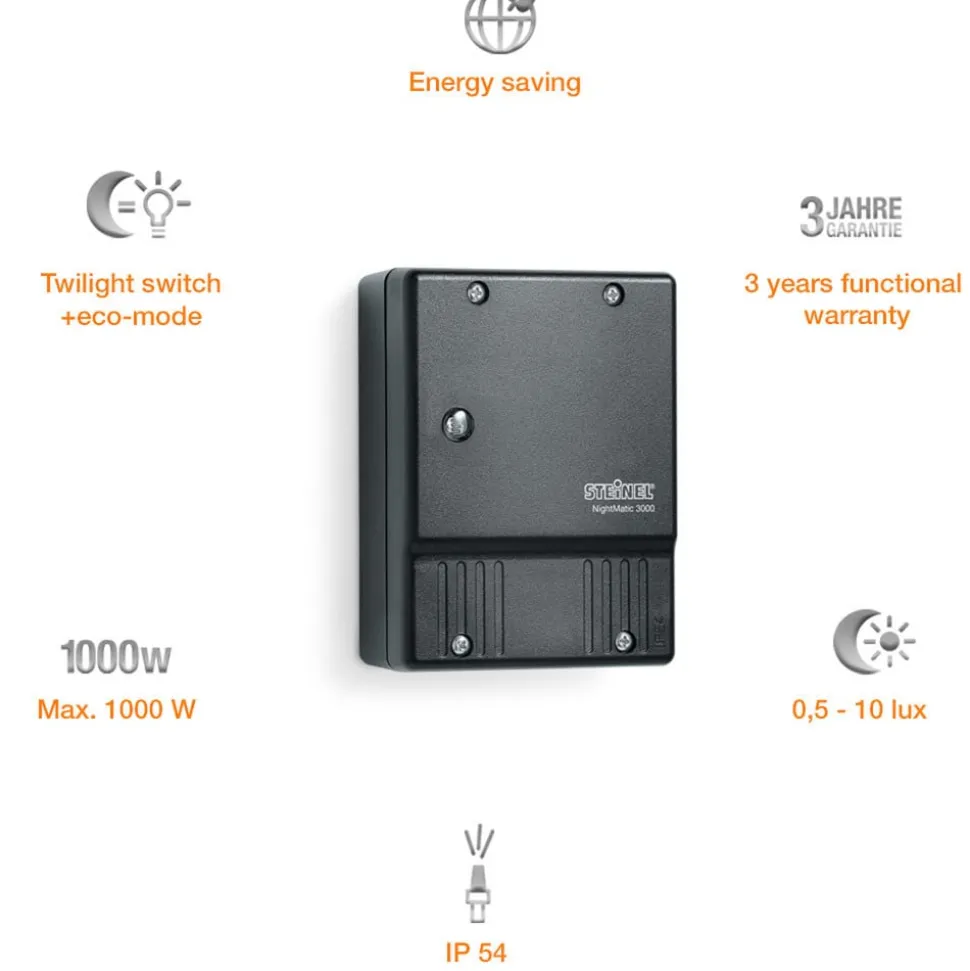 NightMatic 3000 registrerer lysstyrken i omgivelsene og slår automatisk på tilkoblede lys om kvelden når tussmørketerskelen er nådd og slukker igjen ved daggry. Med sin Vario nattøkonomimodus bidrar den også til å spare strøm. Hvis ønskelig, slår den av lyset automatisk om natten etter en programmerbar tid og slår den på igjen om morgenen rundt klokken 05.00 – hvis det fortsatt er mørkt. Den er utstyrt med selvlyskompensasjon, det vil si at et eksternt lys i nærheten ikke forstyrrer funksjonen.