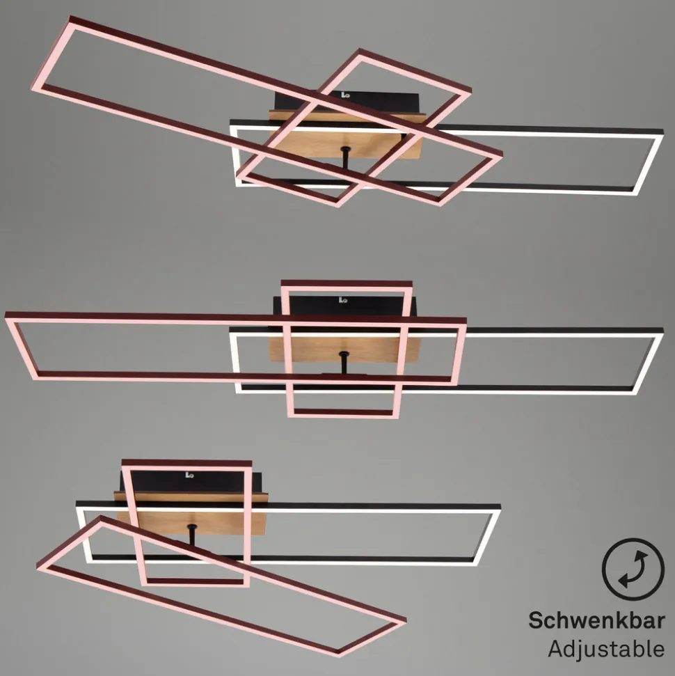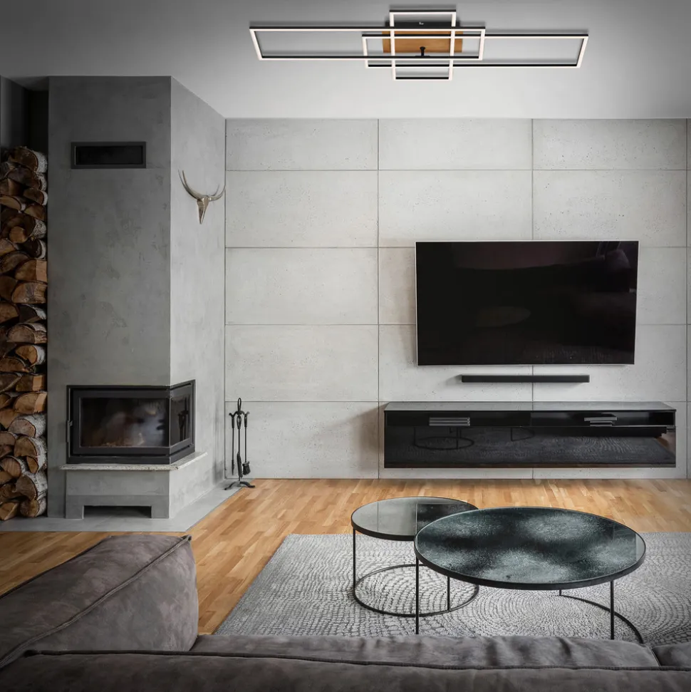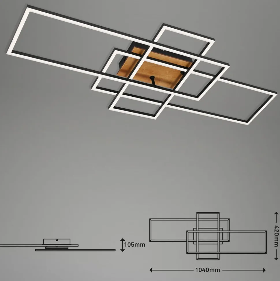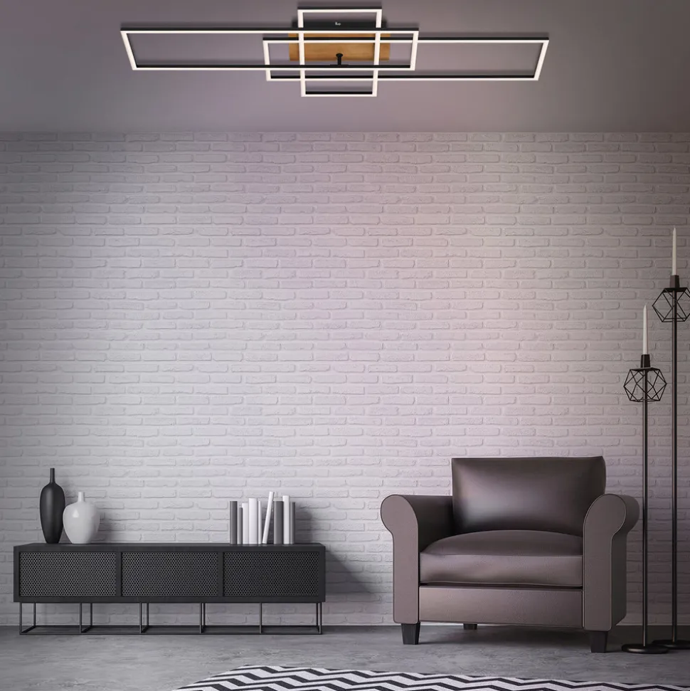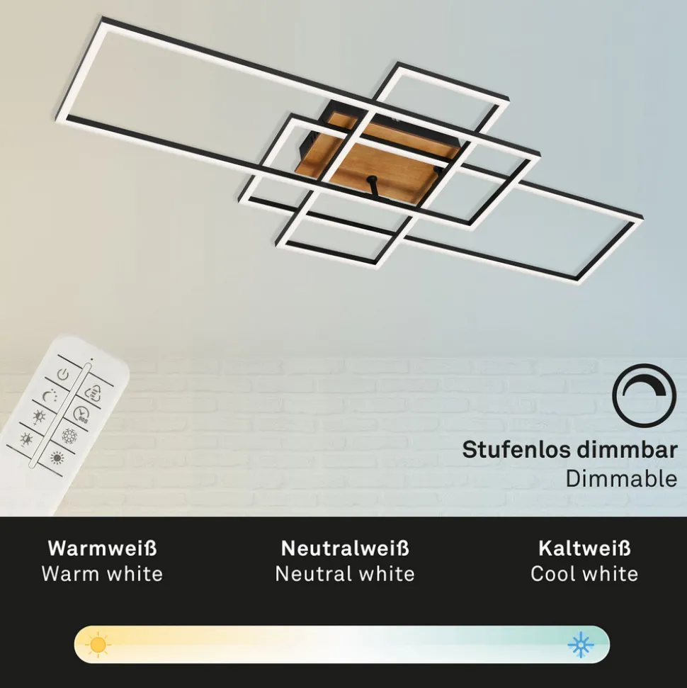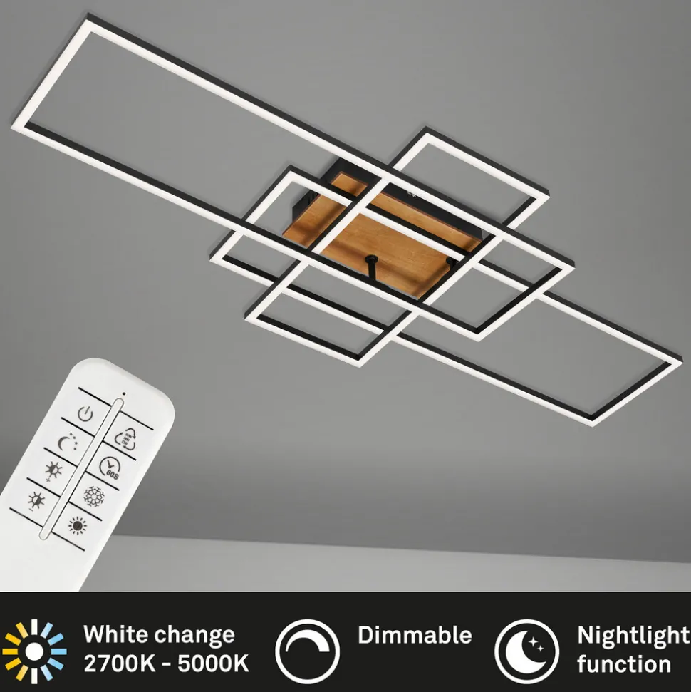 Stor Frame LED-taklampe med CCT-funksjon inkl. fjernkontroll Frame LED-taklampe består av tre rammeformede lyselementer i svart metall med satinert plastdeksel og integrerte lysdioder. Rammene er plassert på ulike måter på den firkantede baldakinen, som har en støtte i tre. Denne kombinasjonen gjør armaturen til et interessant belysningsobjekt som utstråler litt 70-tallssjarm. Lysfargen på de integrerte LED-lampene kan tilpasses enhver situasjon fra varmhvitt lys med 2700 K til universalhvit belysning med 5000 K ved hjelp av den medfølgende fjernkontrollen. Uansett hvilken lysfarge som velges, kan lysstyrken dimmes trinnløst med fjernkontrollen, og en nattlysfunksjon kan også velges med fjernkontrollen.